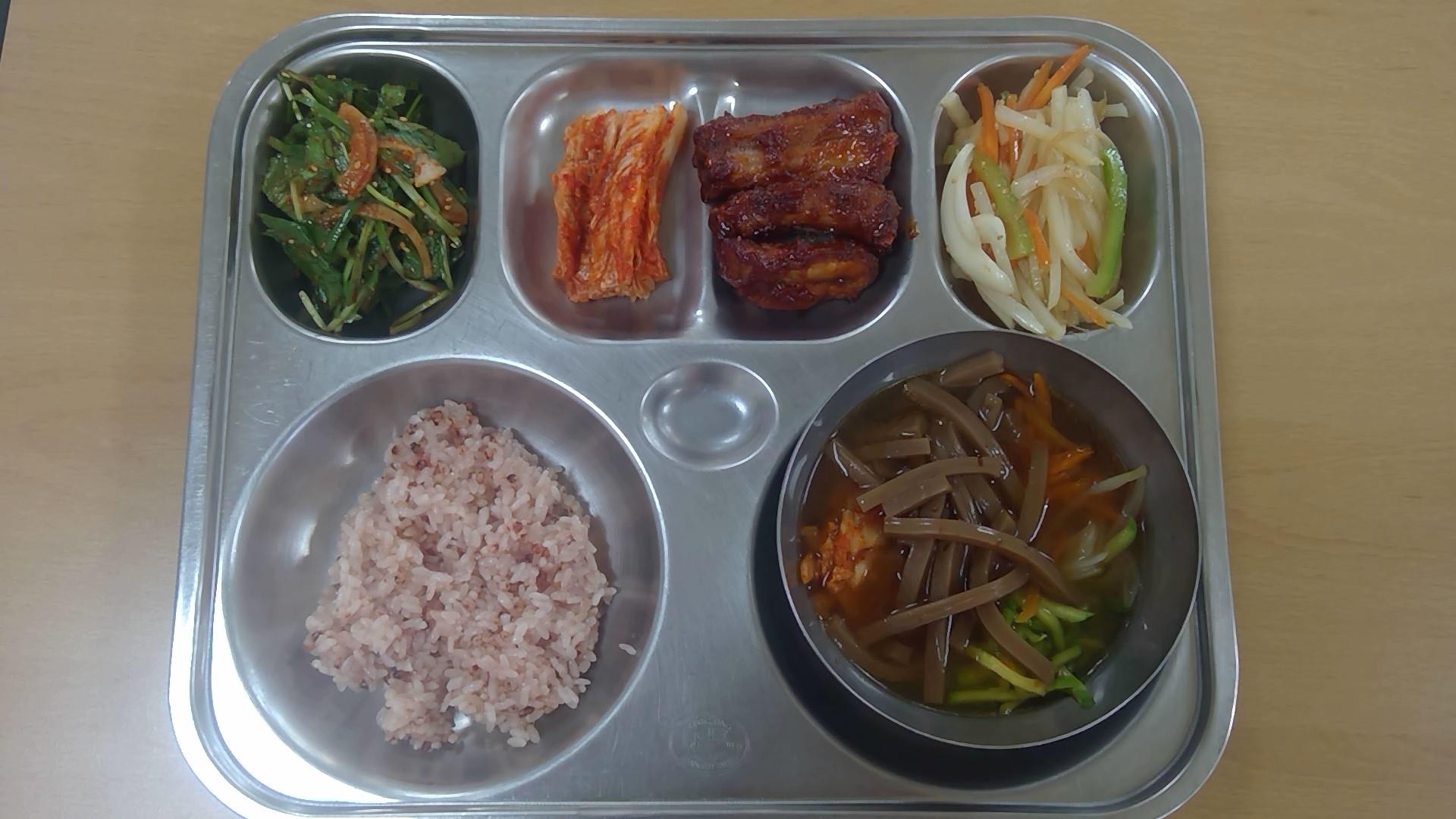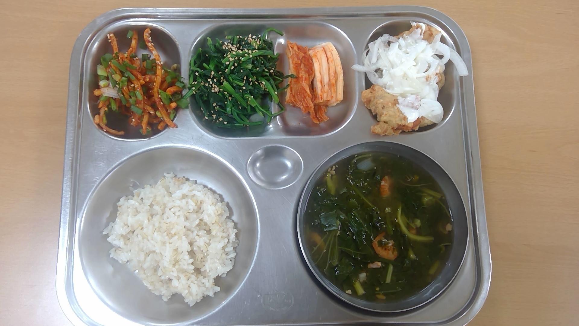 ㆍ보리밥 ㆍ건새우아욱국(5.6.9) ㆍ시금치나물(5.6) ㆍ진미포무침(5.6.13.17) ㆍ크리미양파순살치킨(1.2.5.6.13.15) ㆍ배추김치(9) ㆍ우유(2) | ㆍ수수밥 ㆍ도토리묵채국(5.6.9) ㆍ겨울초겉절이(13) ㆍ감자채볶음(5) ㆍ등갈비바베큐폭립(5.6.10.12.13) ㆍ배추김치(9) ㆍ우유(2) | ㆍ전복곤드레나물밥(5.6.18) ㆍ황태미역국.(5.6) ㆍ무생채(13) ㆍ배추김치(9) ㆍ우유(2) ㆍ치즈피자.(1.2.5.6.10.12.13.15.16) | ㆍ영양잡곡밥(5) ㆍ만두전골.(1.5.6.10.15.16.18) ㆍ생율쌈추겉절이(5.6.13) ㆍ오리부추볶음(5.6.13) ㆍ멸치꽈리고추볶음(5.6.13) ㆍ배추김치(9) ㆍ우유(2) ㆍ무쌈(일반) | ㆍ(흰밥) ㆍ다채짬짜면(5.6.9.10.13.16.17.18) ㆍ오이송송이무침(13) ㆍ칠리새우강정(1.5.6.9.12.13) ㆍ배추김치(9) ㆍ귤 ㆍ우유(2) |