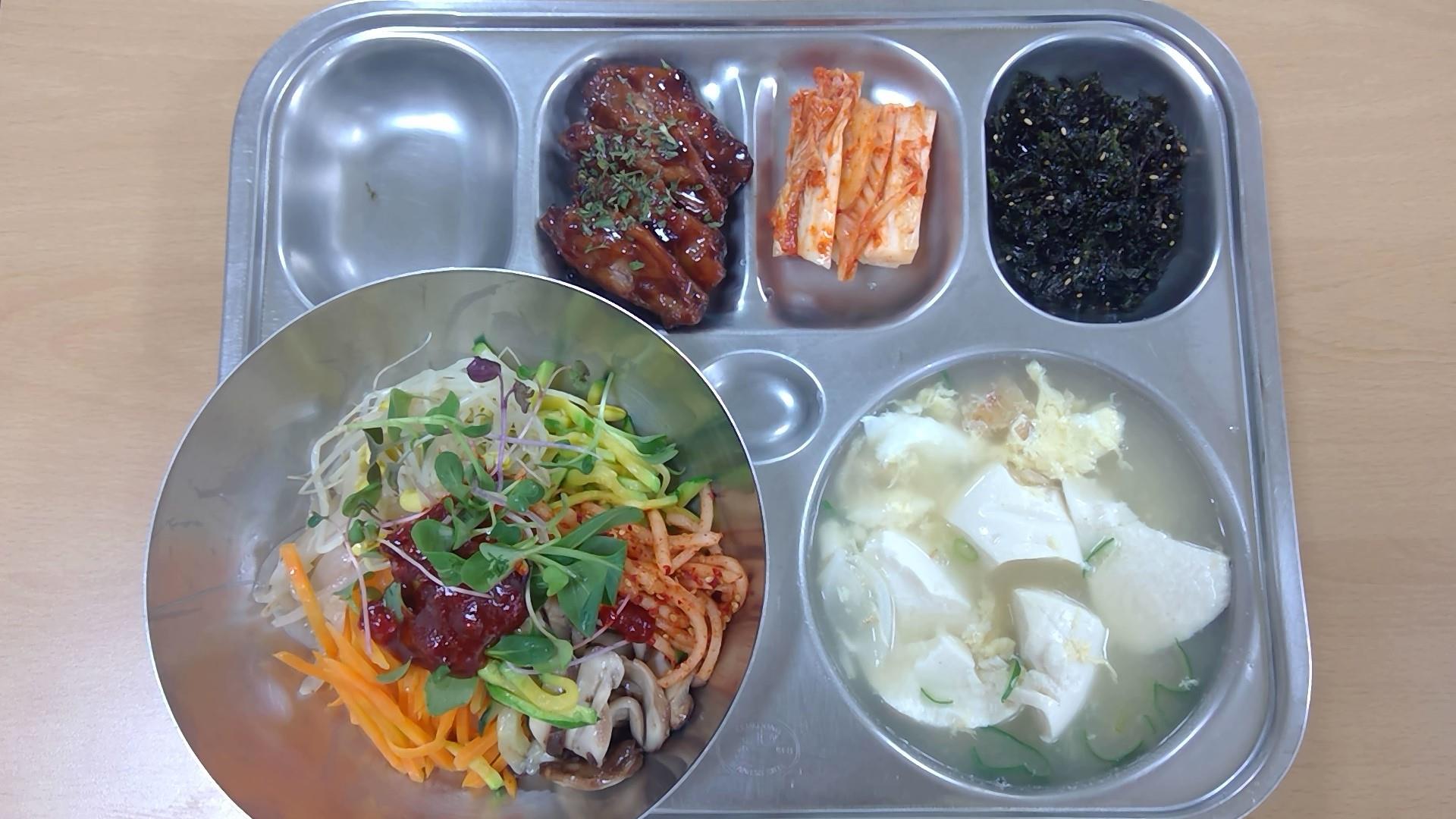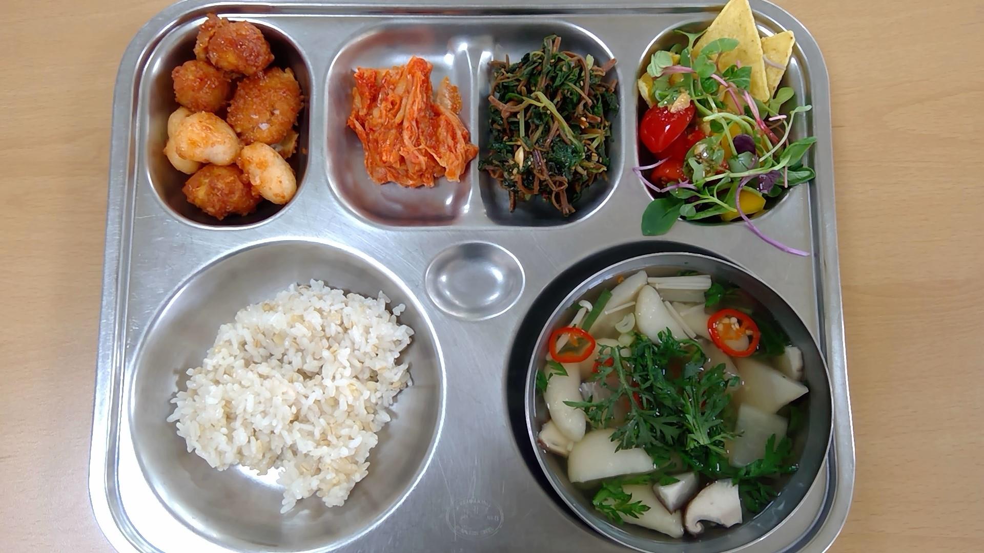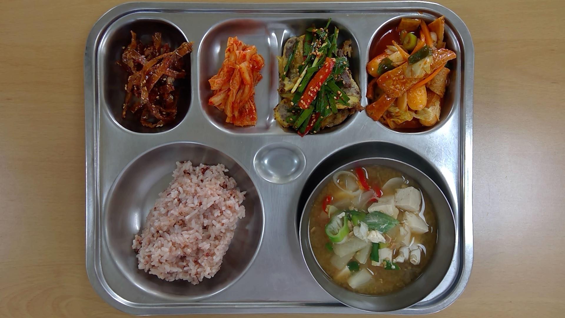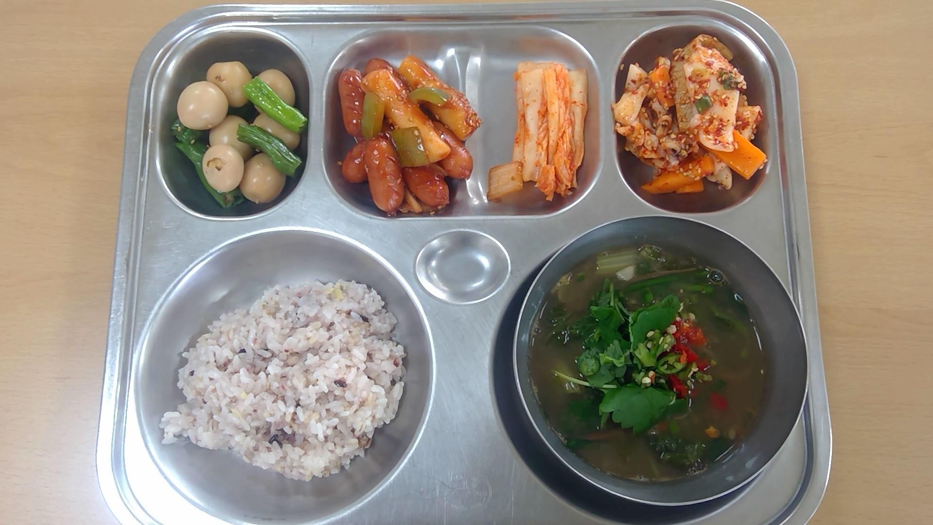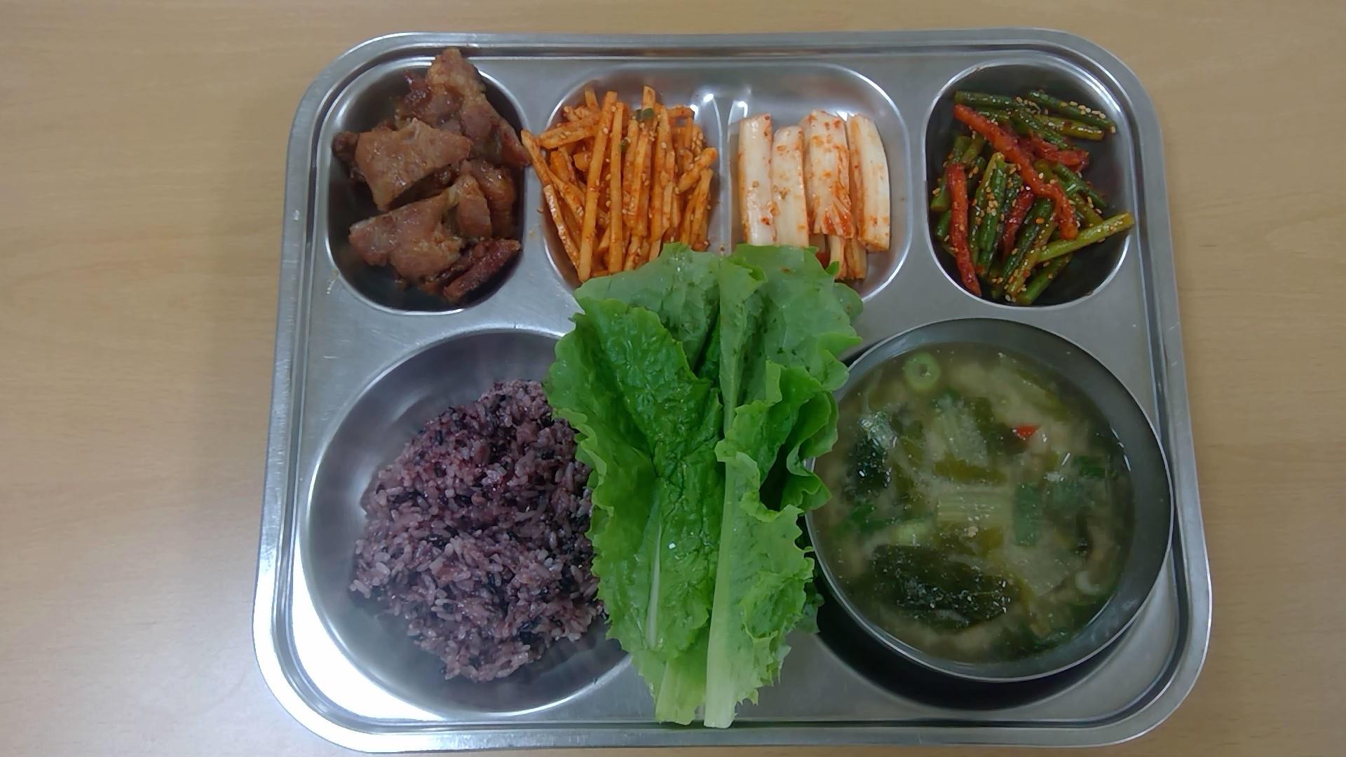 ㆍ흑미밥 ㆍ단배추국(5.6) ㆍ돼지고기맥적구이(5.6.10.13) ㆍ진미포마늘쫑무침(5.6.13.17) ㆍ콜라비생채(13) ㆍ(상추/깻잎쌈)(5.6.13) ㆍ우유(2) | ㆍ혼합잡곡밥(5) ㆍ추어탕(5.6) ㆍ메추리알장조림(1.5.6.13) ㆍ충무식오징어무침(1.5.6.13.17) ㆍ비엔나야채볶음(2.5.6.10.12.13.15.16.18) ㆍ배추김치(9) ㆍ우유(2) | ㆍ생채비빔밥(5.6.13.16) ㆍ순두부맑은국(1.5) ㆍ닭날개간장구이(5.6.13.15) ㆍ배추김치(9) ㆍ우유(2) ㆍ김자반(5) | ㆍ수수밥 ㆍ해물된장찌개(5.6.8.18) ㆍ쥐포땅콩조림(4.5.6.13) ㆍ치즈떡볶이.(1.2.5.6.13) ㆍ쇠고기육전(1.13.16) ㆍ배추김치(9) ㆍ우유(2) | ㆍ찰보리밥 ㆍ모듬어묵국.(1.5.6) ㆍ명태순살떡강정(1.2.5.6.12.13) ㆍ깻잎순된장무침(5.6.13) ㆍ나쵸샐러드(1.2.5.6.12.13) ㆍ배추김치(9) ㆍ우유(2) |