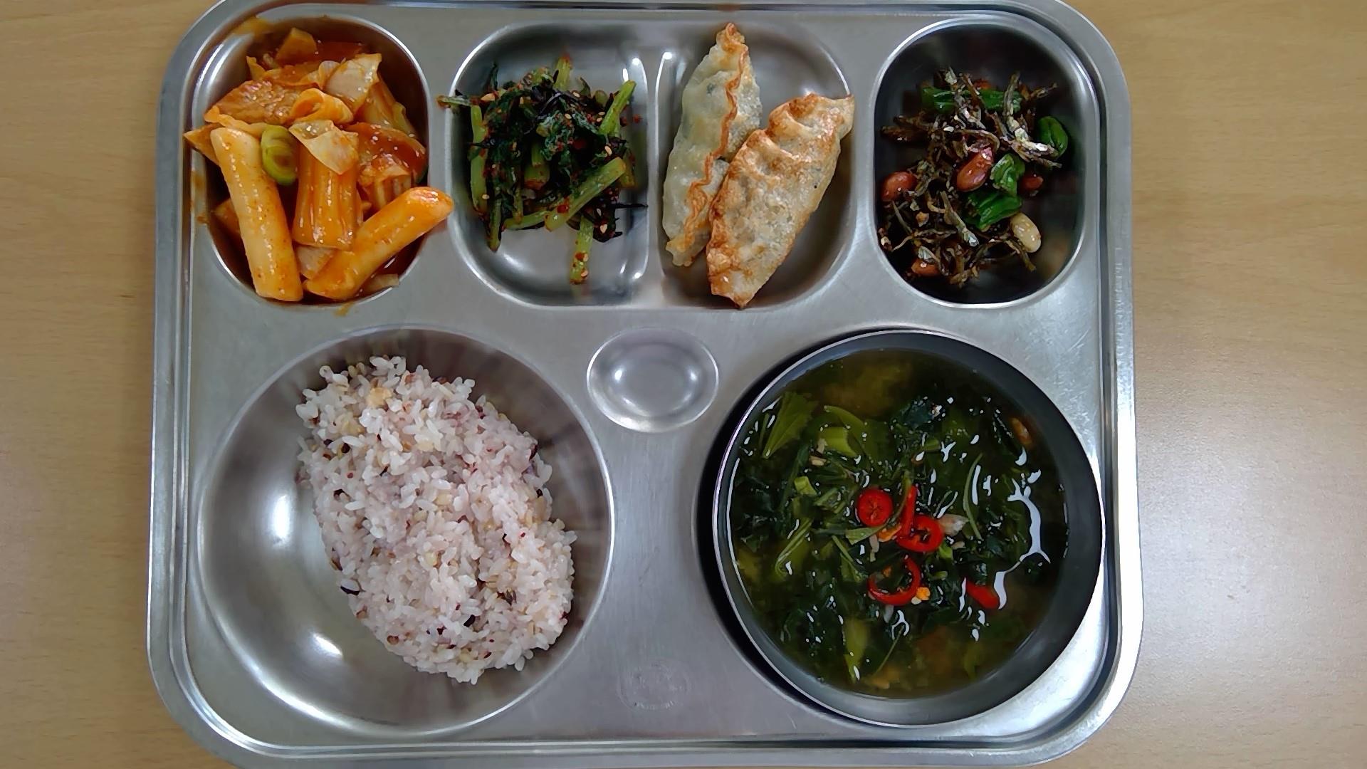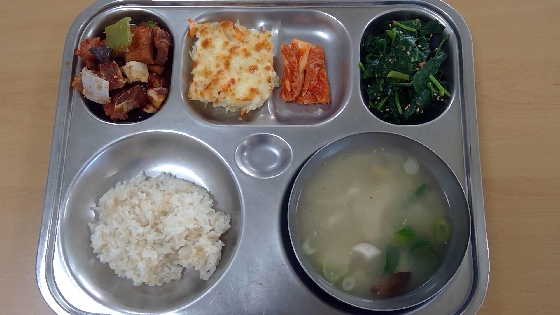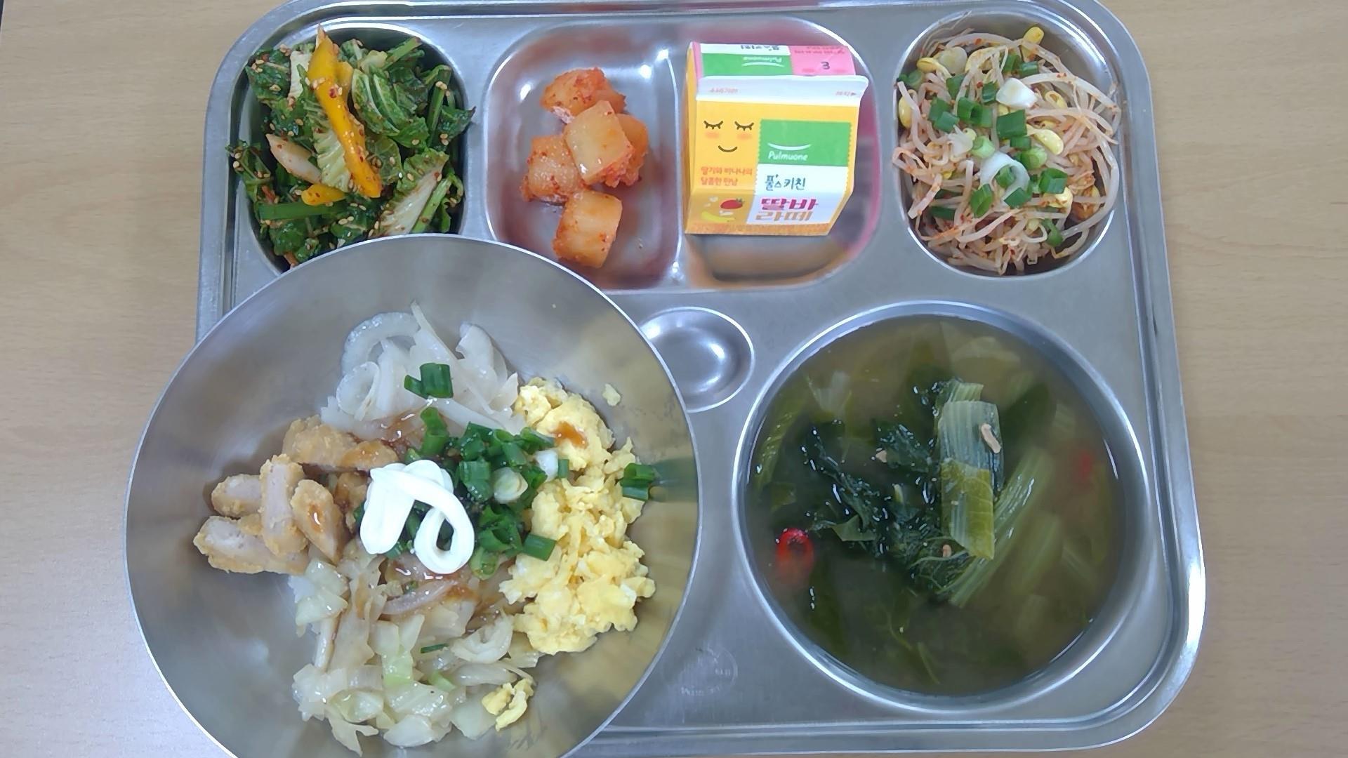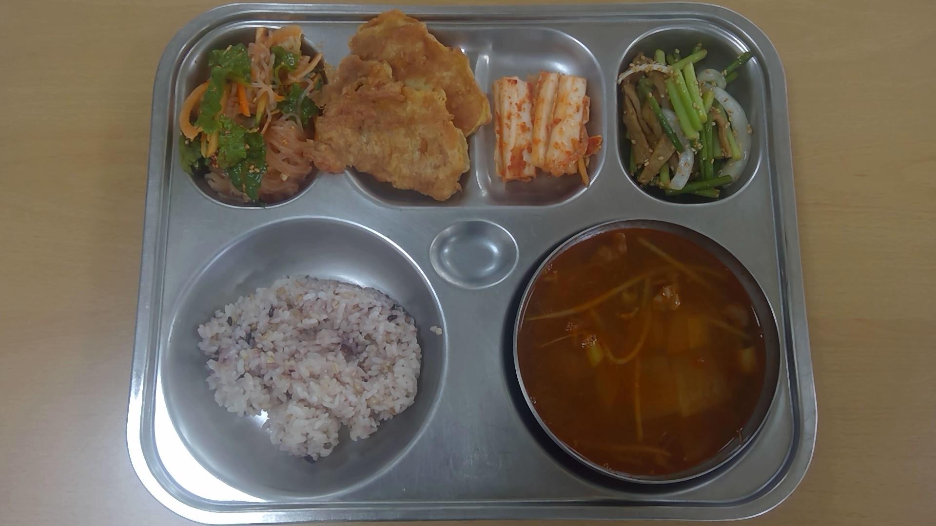 | ㆍ혼합잡곡밥(5) ㆍ쇠고기무국(5.6.16) ㆍ실곤약야채무침(5.6.13) ㆍ어묵마늘쫑볶음(1.5.6.13) ㆍ순살명태전(1.5.6) ㆍ배추김치(9) ㆍ우유(2) | ㆍ치킨마요덮밥(1.2.5.6.13.15) ㆍ(된장시래기찌개)(5.6) ㆍ쌈추겉절이(5.6.13) ㆍ매운콩나물무침(5) ㆍ깍두기(9) ㆍ우유(2) ㆍ딸기바나나주스(13) | ㆍ발아현미밥 ㆍ들깨수제비(5.6.18) ㆍ매콤돼지갈비찜.(5.6.10.13) ㆍ방풍나물무침(5.6) ㆍ오븐감자채치즈구이(2) ㆍ배추김치(9) ㆍ우유(2) | ㆍ혼합잡곡밥(5) ㆍ건새우아욱국(5.6.9) ㆍ멸치땅콩조림(4.13) ㆍ열무톳김치(13) ㆍ분모자떡볶이(1.5.6.13) ㆍ교자군만두(1.5.6.10.15.16.18) ㆍ우유(2) |