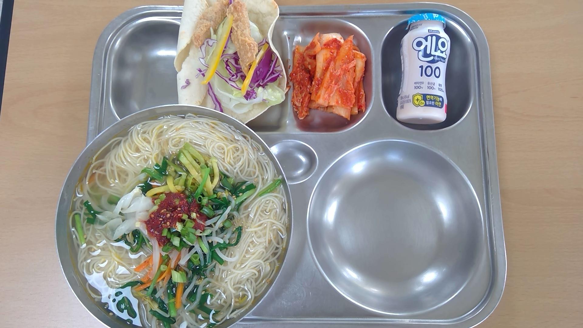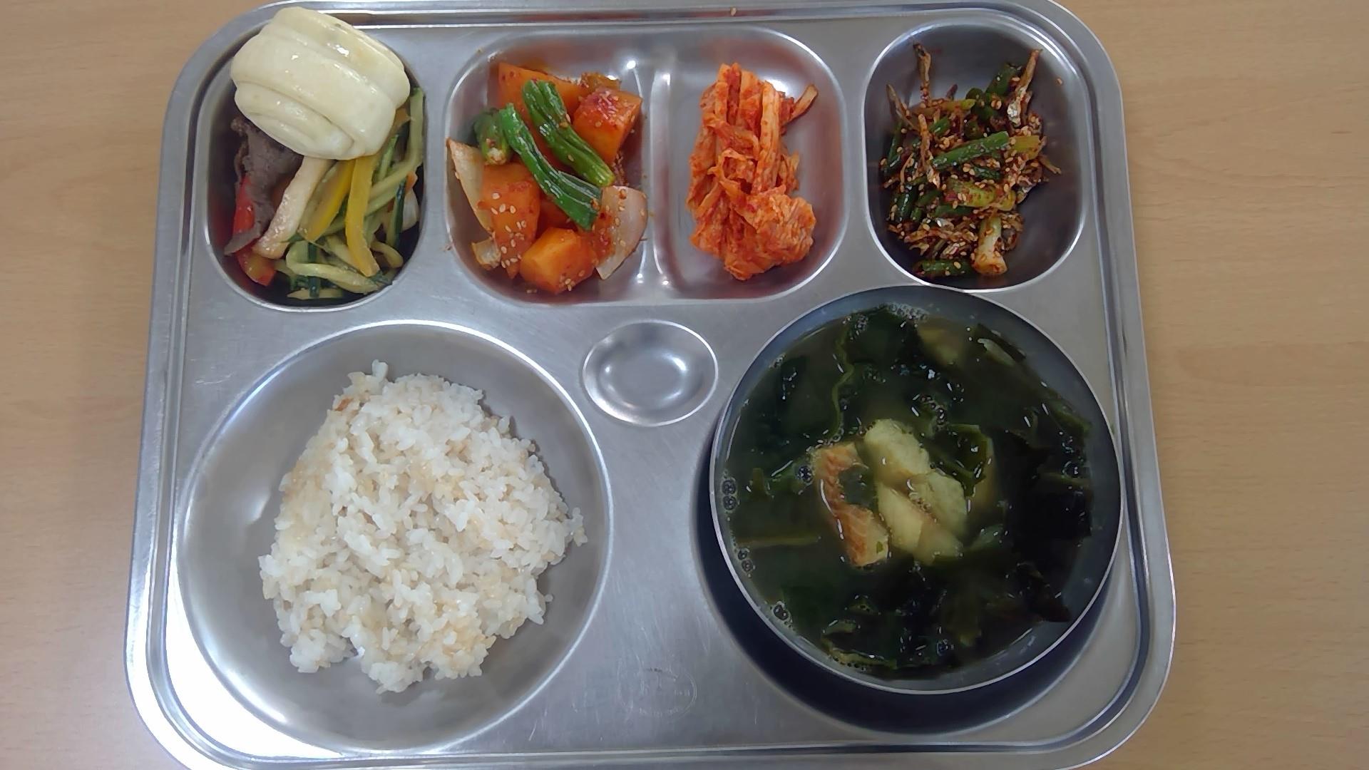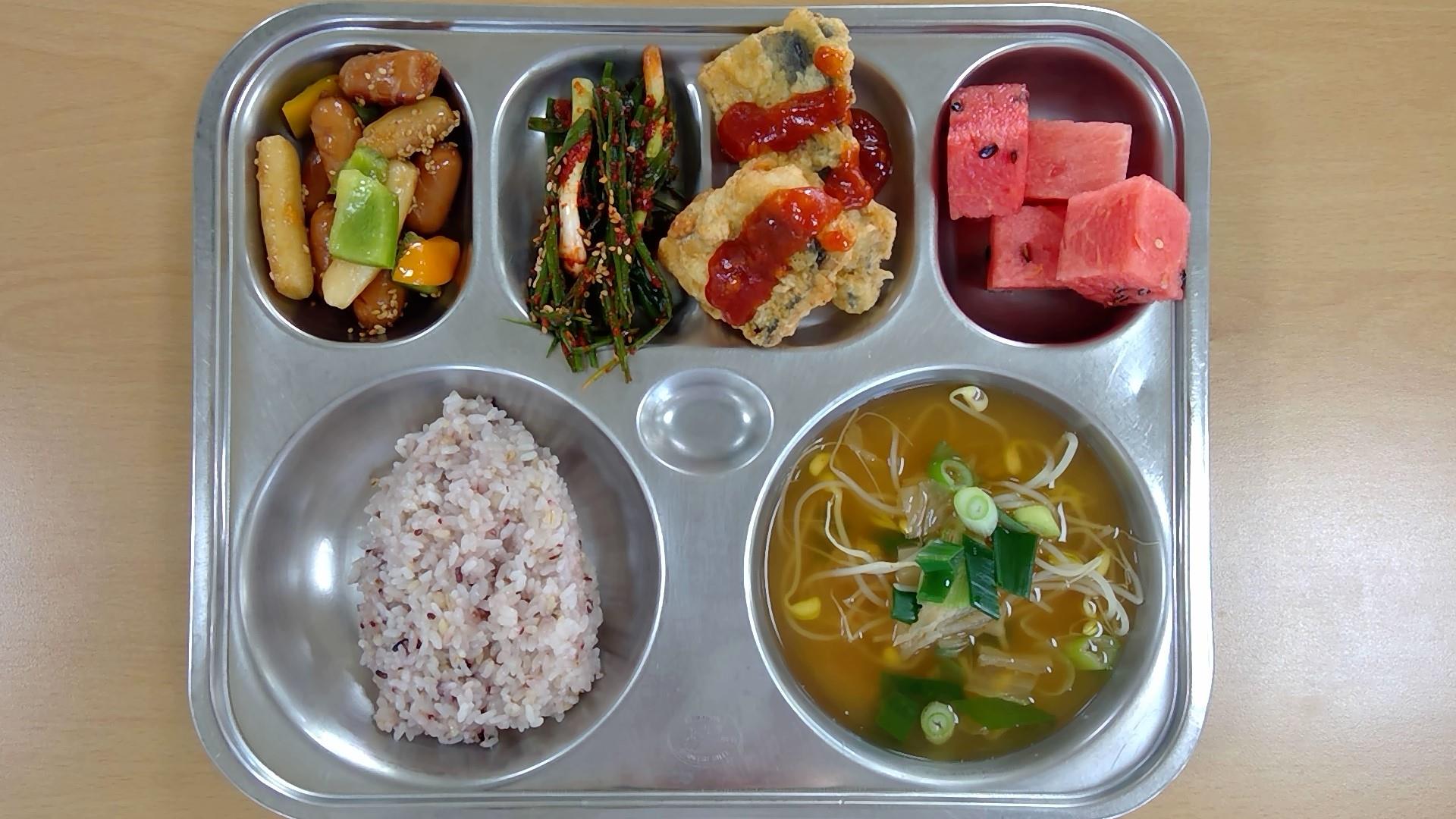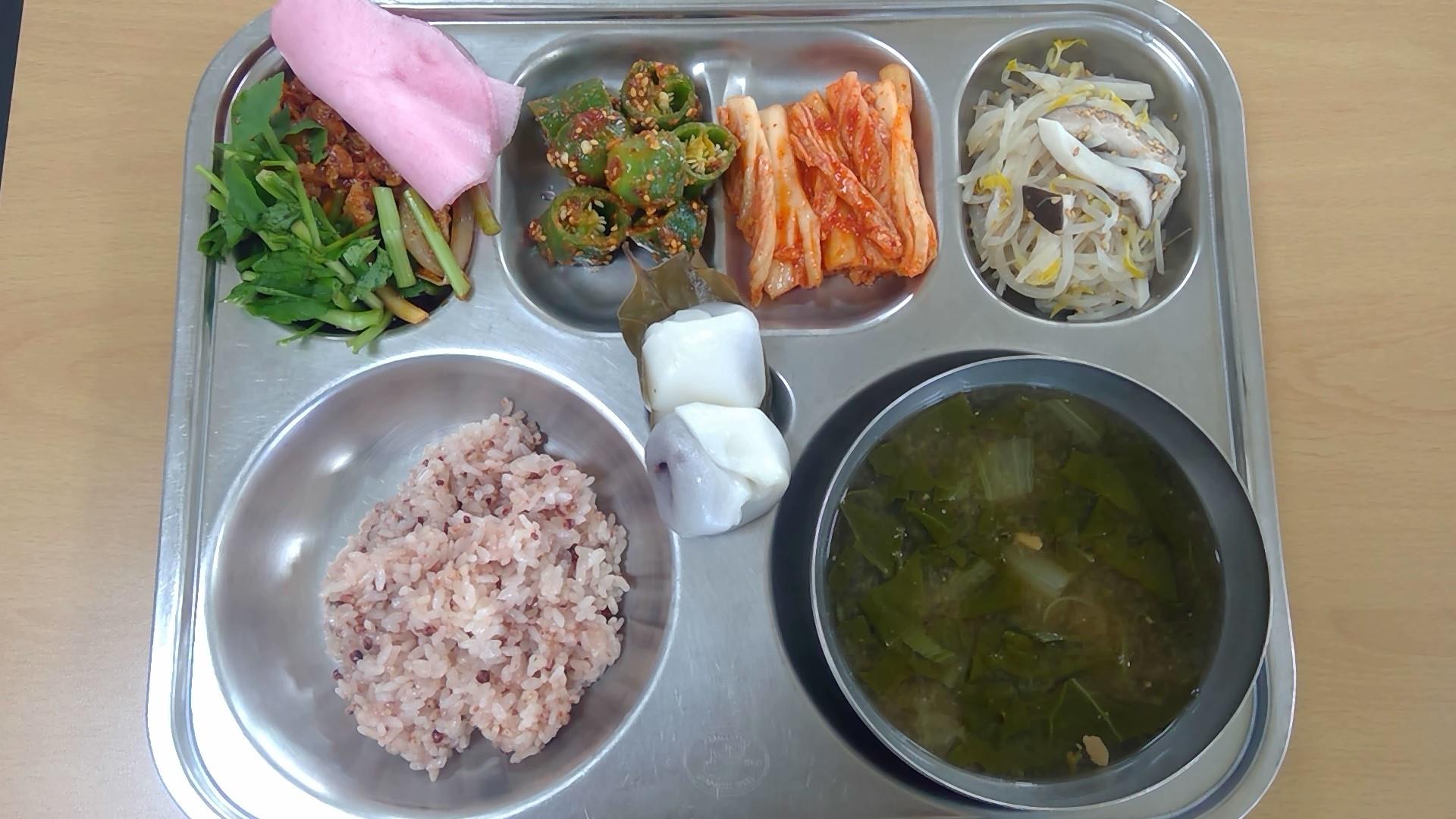 ㆍ찰현미밥 ㆍ황태미역국.(5.6) ㆍ매운감자조림(5.6.13) ㆍ파프리카잡채&꽃빵(5.6.13.16.18) ㆍ멸치잔파무침(5.6.13) ㆍ배추김치(9) ㆍ우유(2) | ㆍ수수밥 ㆍ조갯살근대국(5.6.18) ㆍ숙주새송이무침(5.6) ㆍ아삭고추무침(5.6.13) ㆍ오리미나리볶음&무쌈(5.6.13) ㆍ배추김치(9) ㆍ우유(2) ㆍ망개떡 | ㆍ잔치국수.(5.6) ㆍ배추김치(9) ㆍ우유(2) ㆍ치킨또띠아(1.2.5.6.13.15) ㆍ액상요구르트(2) | ㆍ기장밥 ㆍ김치콩나물국(5.9) ㆍ비엔나야채볶음(2.5.6.10.12.13.15.16.18) ㆍ삼치포튀김/치킨소스(5.6.12.13) ㆍ파김치(13) ㆍ수박 ㆍ우유(2) |
