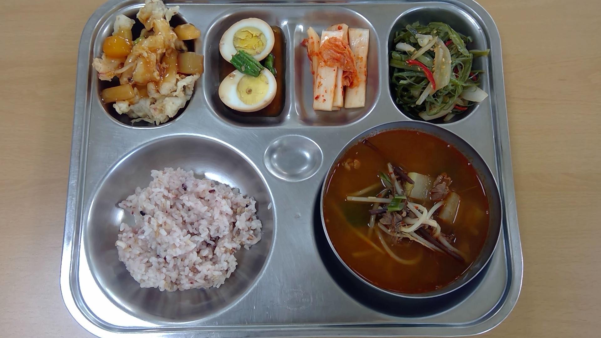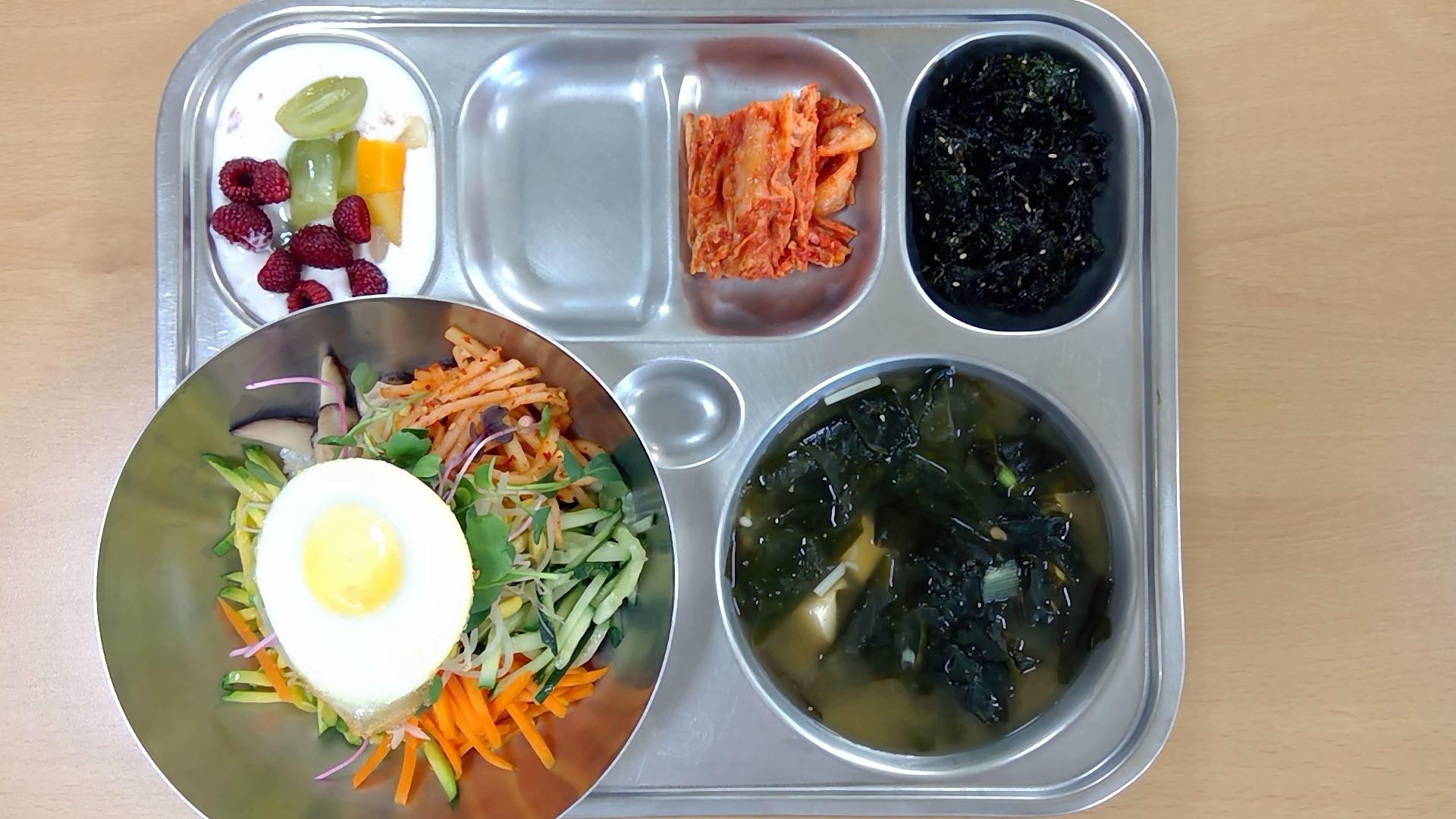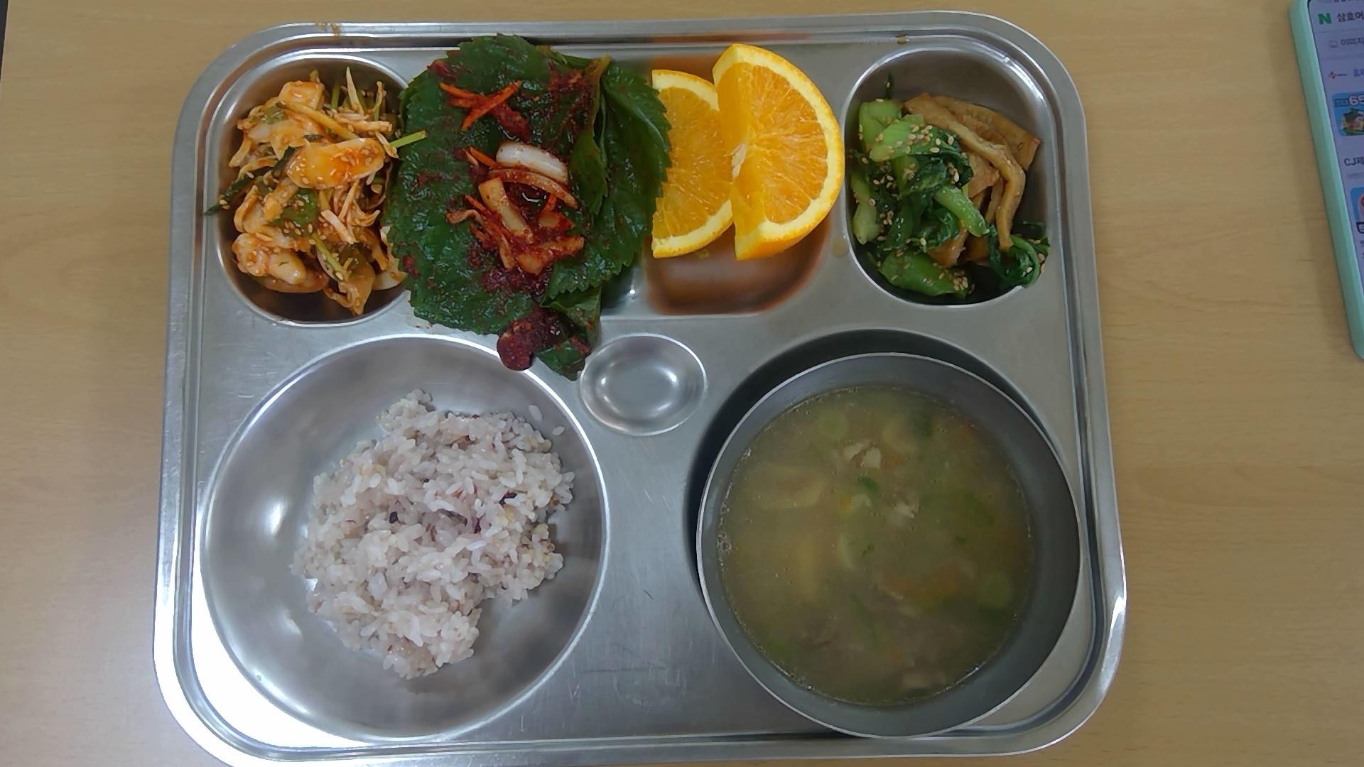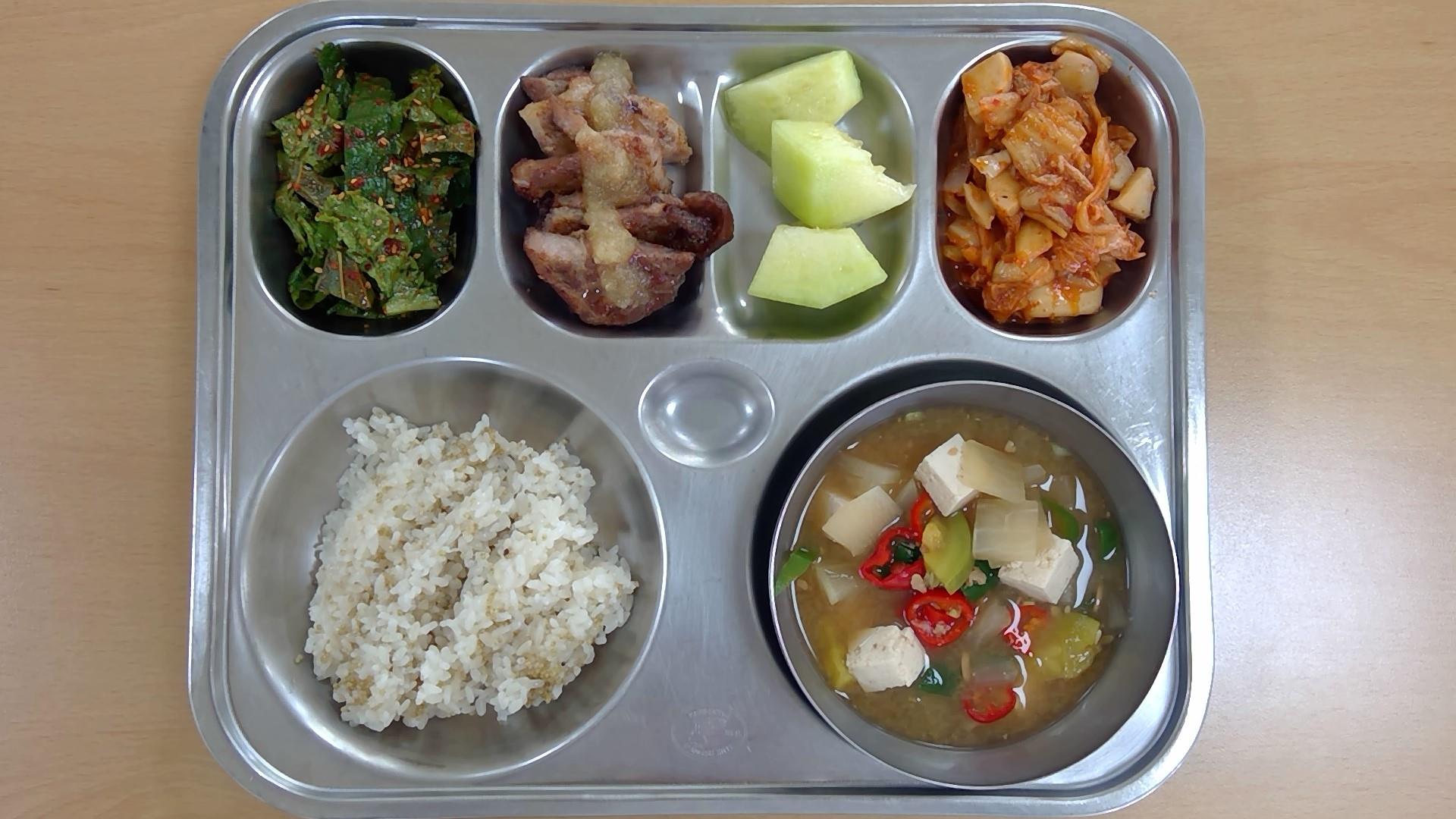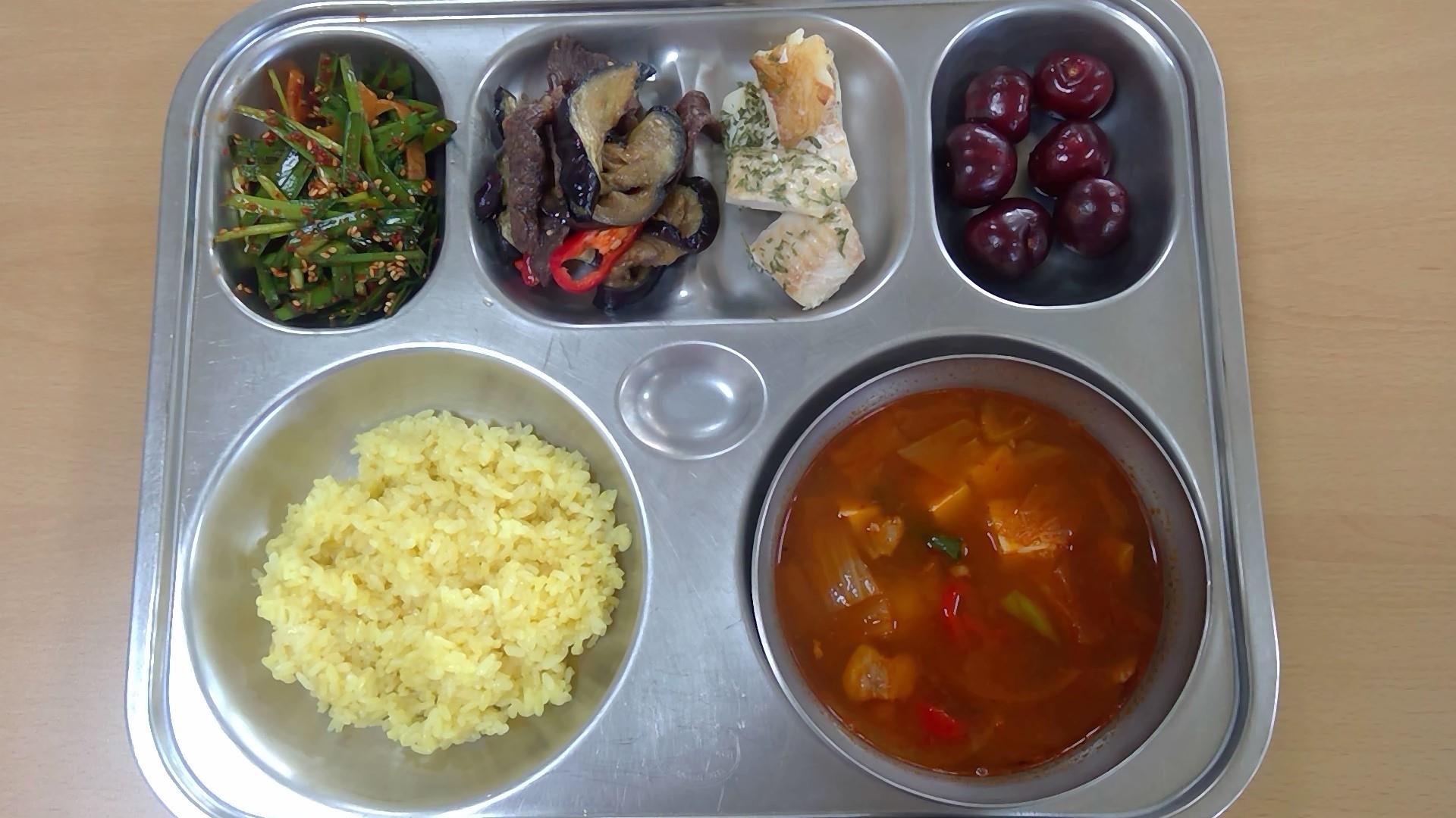 ㆍ혼합잡곡밥(5) ㆍ용압탕 ㆍ깻잎지(5.6.13) ㆍ청경채어묵볶음(1.5.6.13.18) ㆍ오이오징어초무침(5.6.13.17) ㆍ오렌지 ㆍ우유(2) | ㆍ강황쌀밥 ㆍ김치찌개.(5.6.9.10) ㆍ부추겉절이(5.6.13) ㆍ쇠고기가지볶음(5.6.13.16) ㆍ가자미버터구이(2) ㆍ우유(2) ㆍ체리 | ㆍ생채비빔밥(5.6.13.16) ㆍ미소된장국(5.6) ㆍ계란후라이(1) ㆍ배추김치(9) ㆍ우유(2) ㆍ김자반(5) ㆍ산딸기요구르트(2.11.13) | ㆍ차조밥 ㆍ참미더덕된장국(5.6) ㆍ돈육오븐구이(구운마늘소스)(10) ㆍ상추깻잎겉절이(5.6.13) ㆍ김치야채볶음(5.9.13) ㆍ멜론 ㆍ우유(2) | ㆍ혼합잡곡밥(5) ㆍ콩나물육개장(5.6.16) ㆍ계란장조림(1.5.6.13) ㆍ수제오징어버섯탕수(5.6.11.13.17) ㆍ미역줄기볶음(5.6) ㆍ배추김치(9) ㆍ우유(2) |