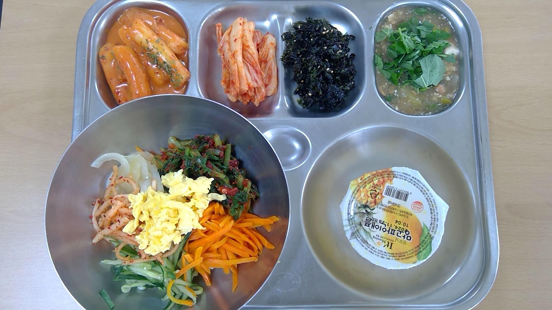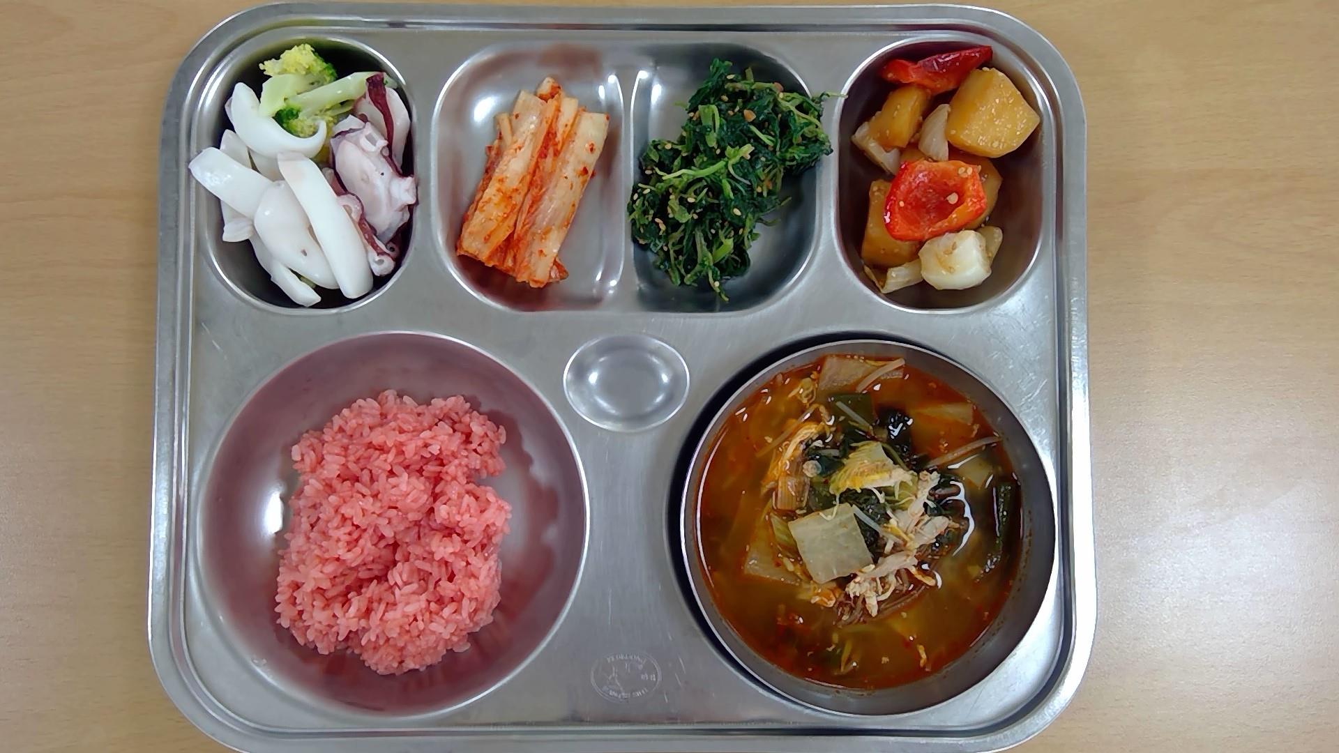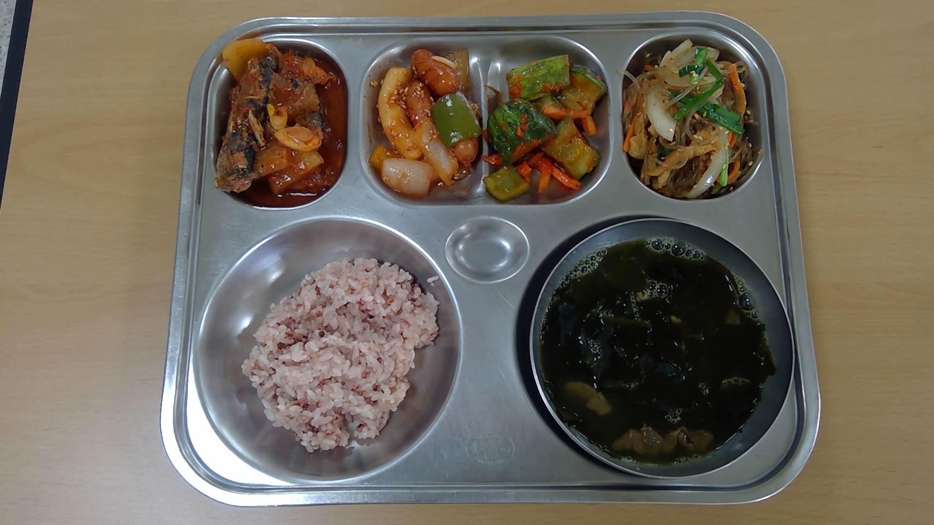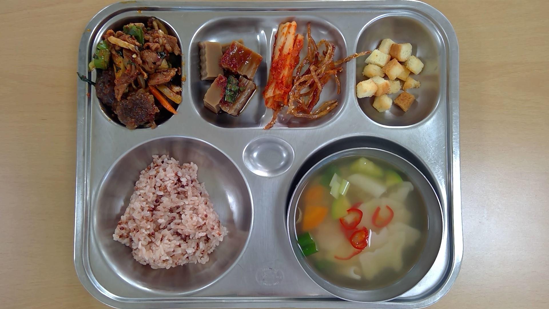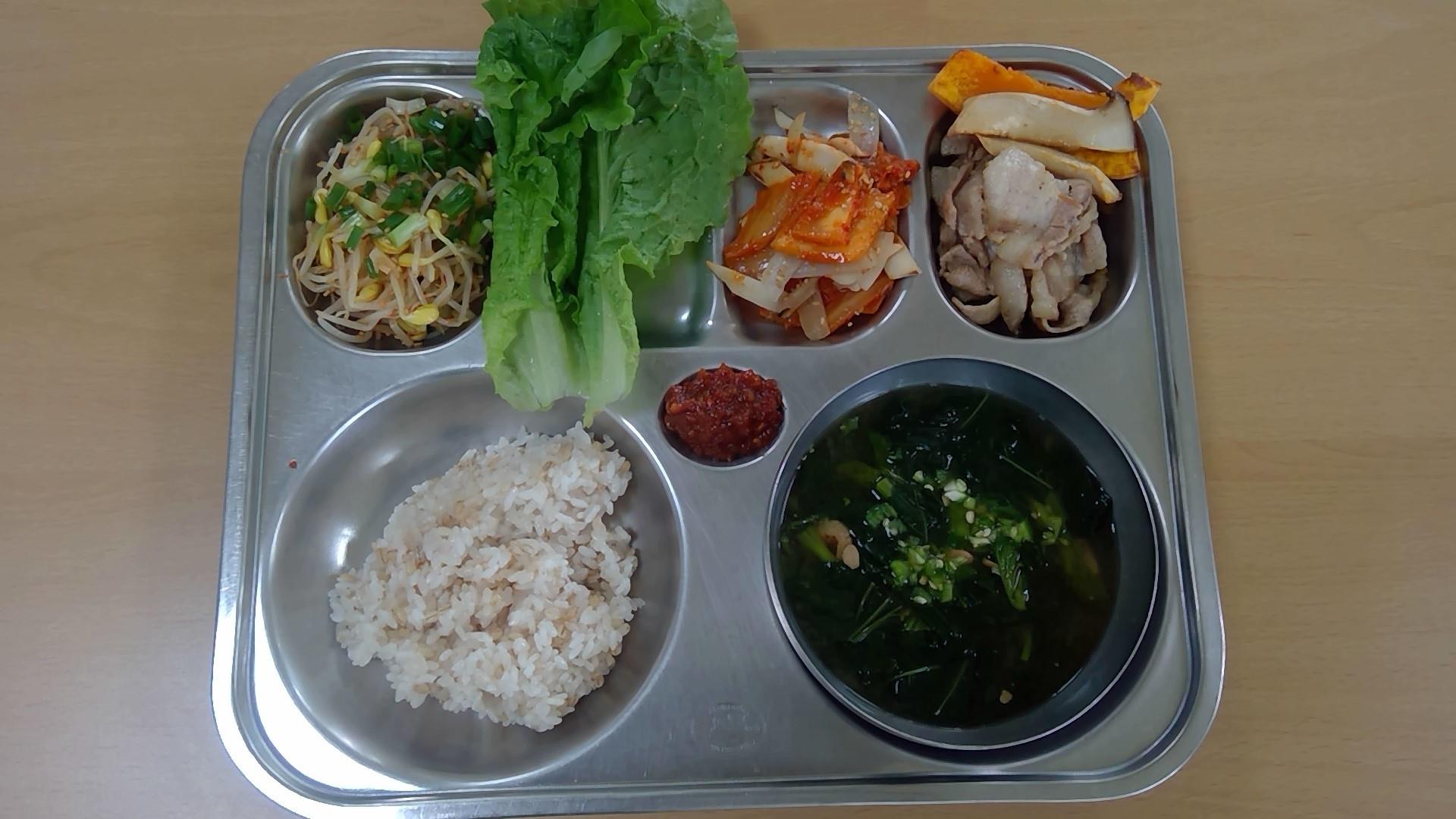 ㆍ찰보리밥 ㆍ건새우아욱국(5.6.9) ㆍ매운콩나물무침(5) ㆍ김치볶움(5.6.9.10.13) ㆍ대패삼겹살구이(5.10) ㆍ(상추/깻잎쌈)(5.6.13) ㆍ우유(2) | ㆍ수수밥 ㆍ쇠고기미역국(5.6.16) ㆍ꽁치무조림(5.6.9.13) ㆍ유부잡채(1.5.6.13) ㆍ비엔나야채볶음(2.5.6.10.12.13.15.16.18) ㆍ오이김치(9) ㆍ우유(2) | ㆍ열무보리비빔밥/약고추장(1.5.6.13.16) ㆍ(강된장)(5.6) ㆍ로제떡볶이(2.5.6.9.12.13) ㆍ배추김치(9) ㆍ우유(2) ㆍ망고파인애플주스(13) ㆍ김자반(5) | ㆍ홍국쌀밥 ㆍ닭개장(5.6.15) ㆍ감자조림.(5.6.13) ㆍ문어오징어숙회(5.6.13.17) ㆍ비름나물된장무침(5.6.13) ㆍ배추김치(9) ㆍ우유(2) | ㆍ수수밥 ㆍ수제비국(5.6.18) ㆍ쥐어채땅콩조림(4.5.6.13) ㆍ순대야채볶음(2.5.6.10.13.16) ㆍ배추김치(9) ㆍ오븐식빵팝콘(2.5.6.13) ㆍ우유(2) ㆍ도토리묵(5.6) |