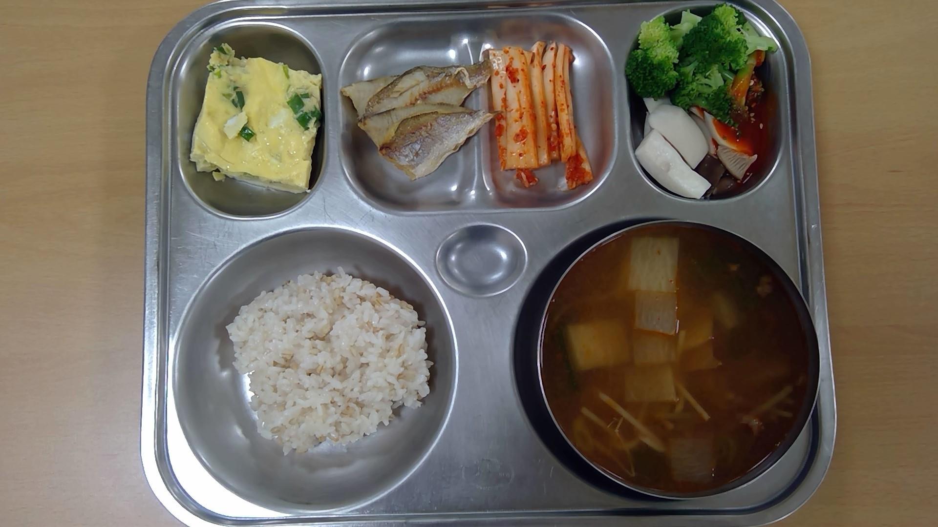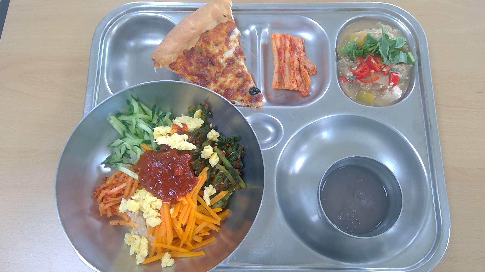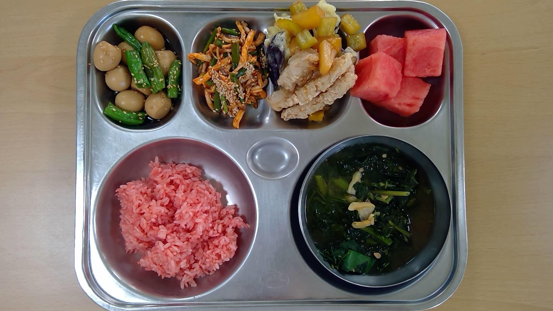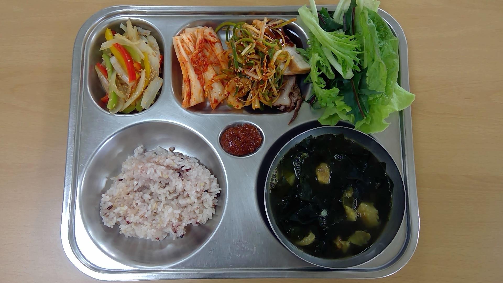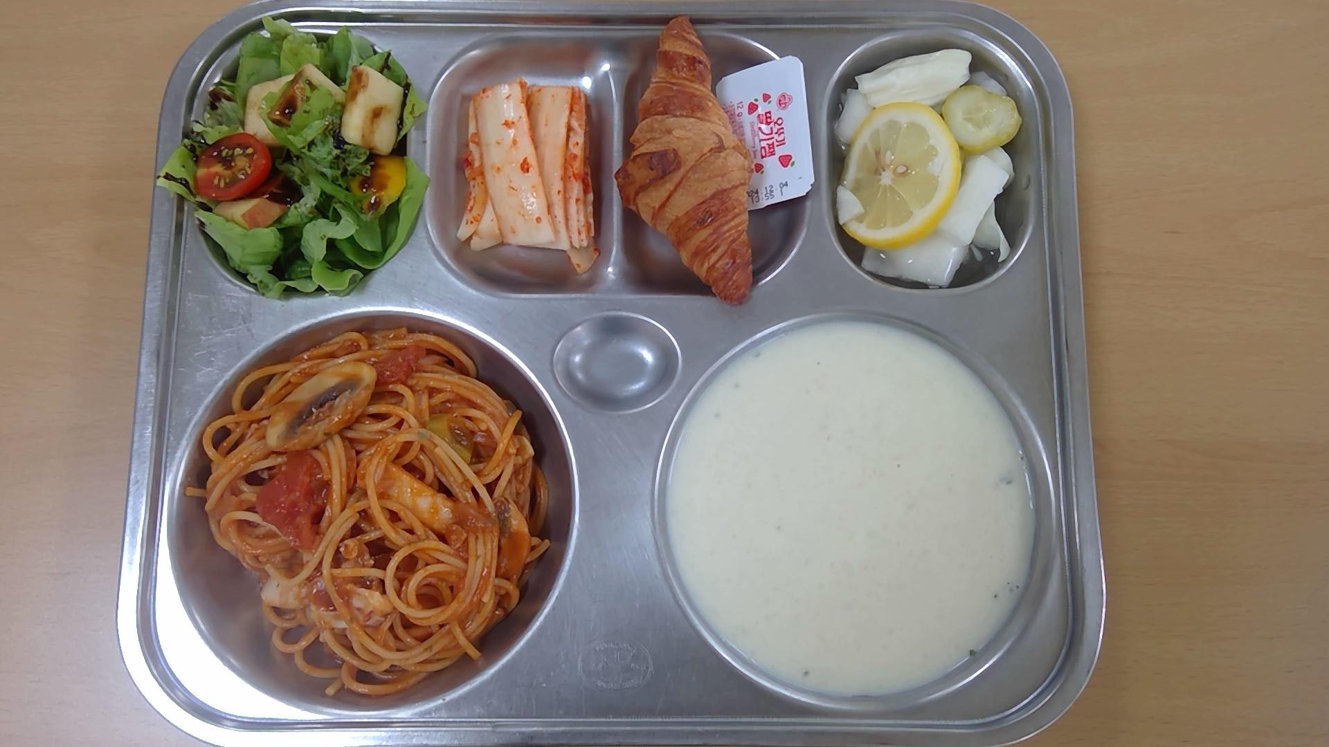 ㆍ혼합잡곡밥(5) ㆍ황태미역국.(5.6) ㆍ동파육/파채토핑.(5.6.10.13) ㆍ감자채파프리카볶음(5) ㆍ배추김치(9) ㆍ우유(2) ㆍ모듬쌈(5.6.13) | ㆍ찰보리밥 ㆍ쇠고기무국(5.6.16) ㆍ계란찜.(1.2.9) ㆍ브로콜리·새송이/초고추장(5.6.13) ㆍ조기순살구이(5.6) ㆍ배추김치(9) ㆍ우유(2) | ㆍ씨푸드토마토스파게티(주식)(1.2.5.6.9.12.13.16.17) ㆍ감자스프.(2.5.6.13.16) ㆍ유럽채소샐러드(오리엔탈소스)(5.6.12.13) ㆍ배추김치(9) ㆍ수제피클(레몬)(13) ㆍ크루아상/딸기잼(1.2.5.6.13) ㆍ우유(2) | ㆍ홍국쌀밥 ㆍ조갯살아욱국(5.6.18) ㆍ메추리알장조림(1.5.6.13) ㆍ애느타리잔파초무침(5.6.13) ㆍ돈육가지탕수(1.5.6.10.11.13) ㆍ수박 ㆍ우유(2) | ㆍ열무보리비빔밥/약고추장(1.5.6.13.16) ㆍ(강된장)(5.6) ㆍ배추김치(9) ㆍ우유(2) ㆍ치즈피자.(1.2.5.6.10.12.13.15.16) ㆍ직접만든식혜(6.13) |