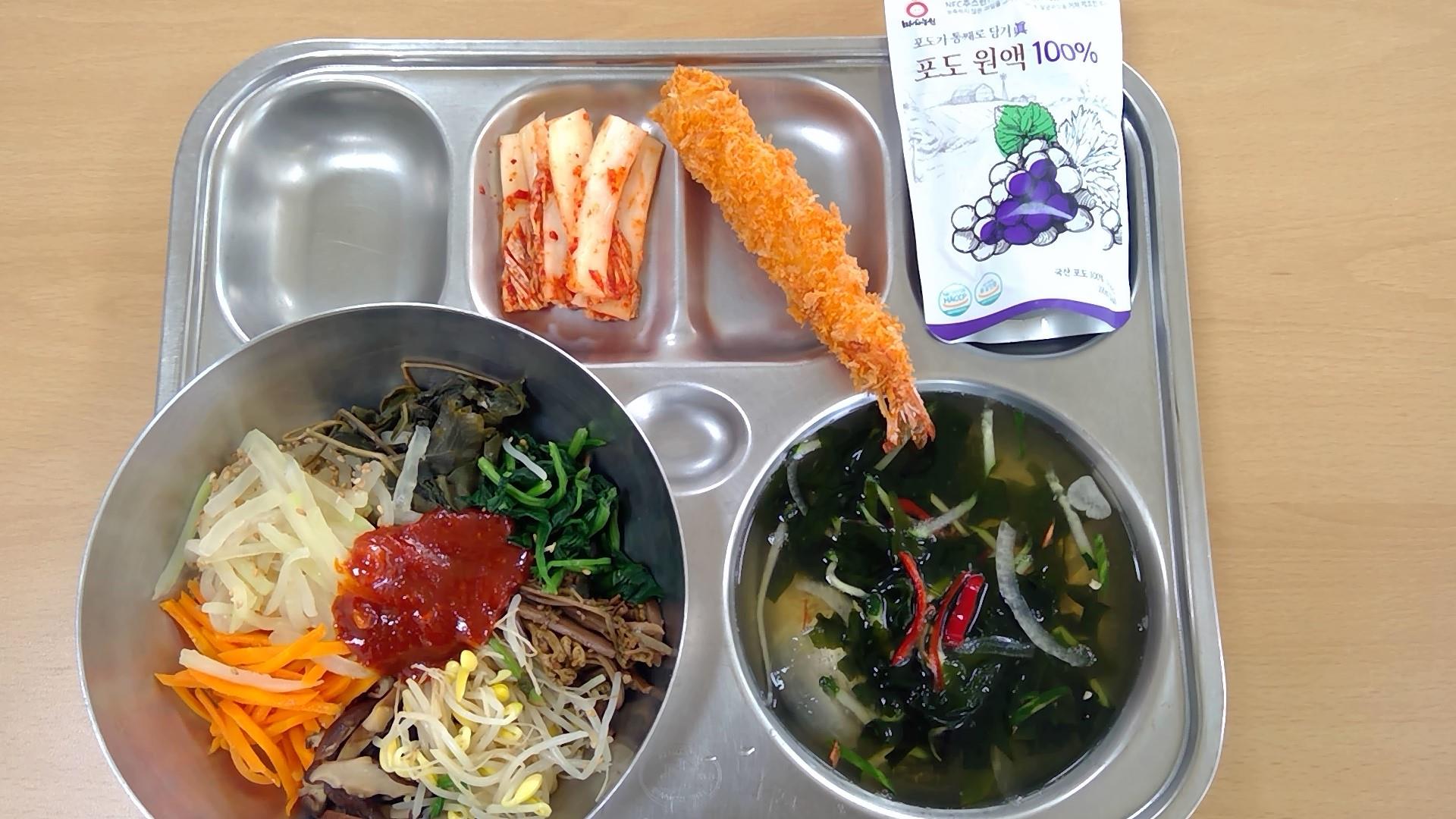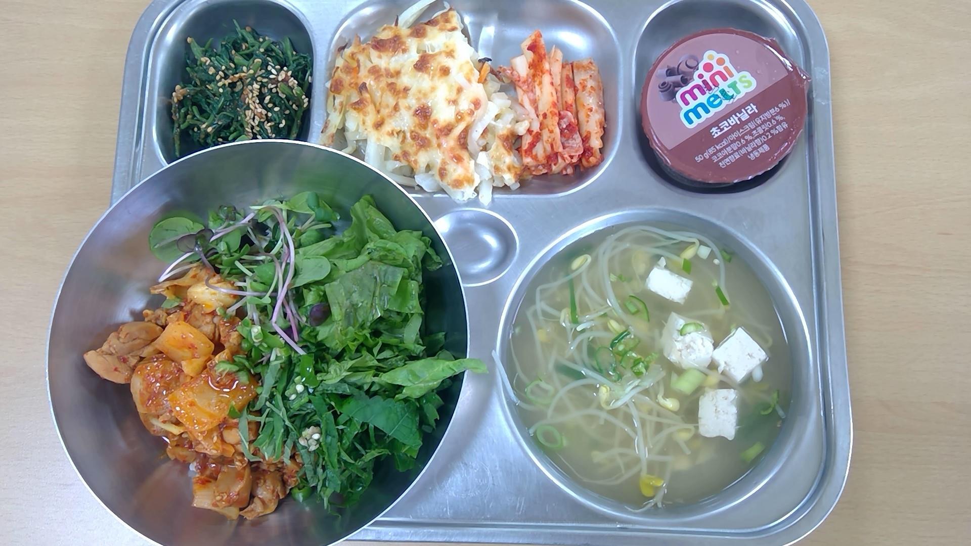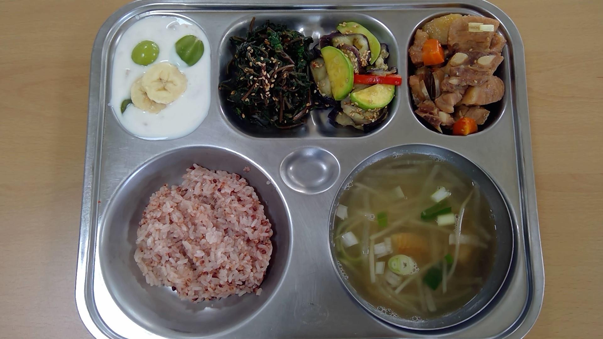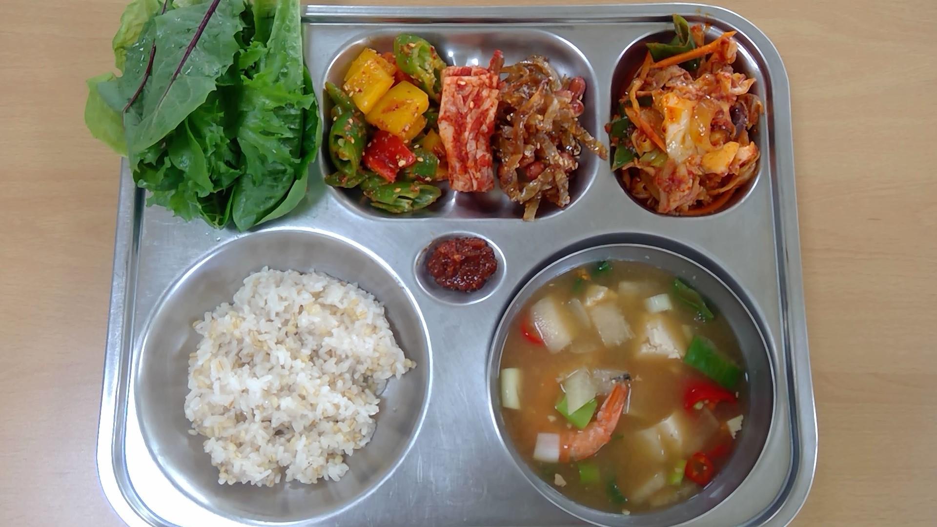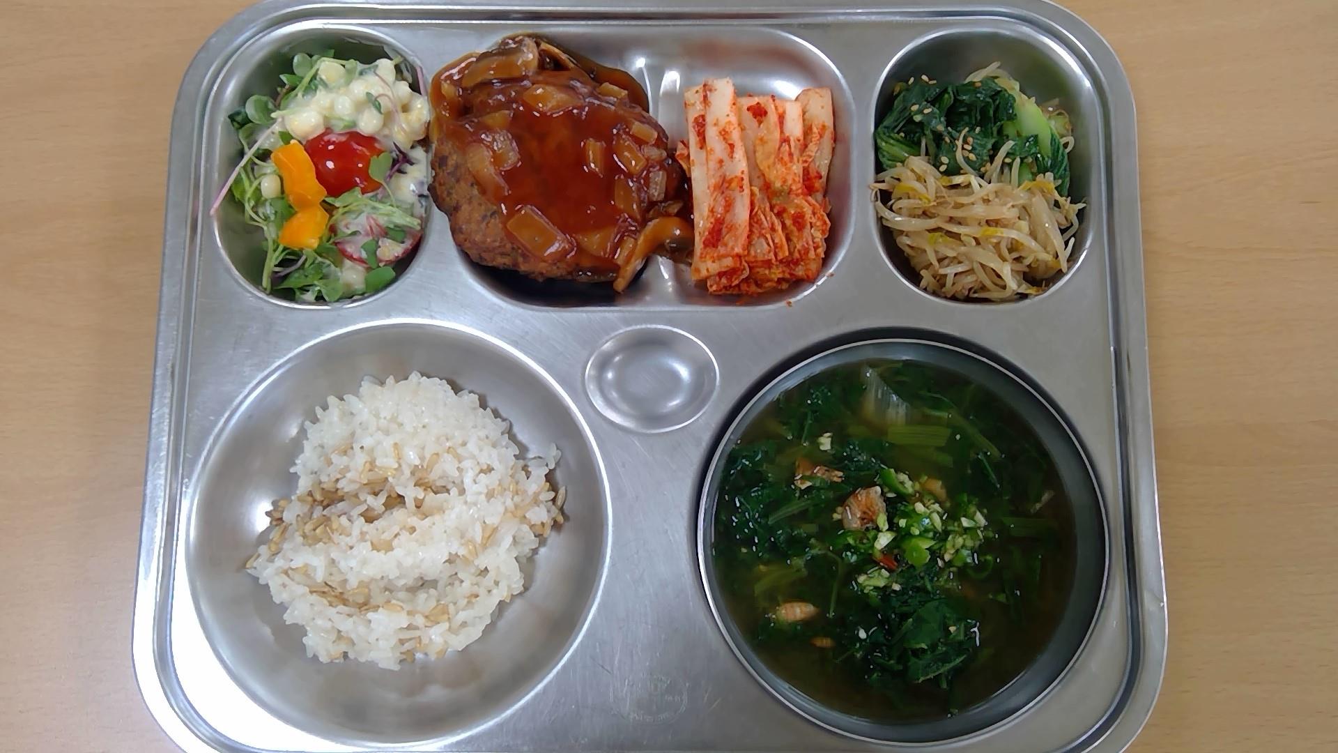 ㆍ찰보리밥 ㆍ새우된장찌개(5.6.9) ㆍ쥐포땅콩조림(4.5.6.13) ㆍ아삭고추/파프리카된장무침(5.6.13) ㆍ오삼불고기(5.6.10.13.17) ㆍ(배추김치)(9) ㆍ모듬쌈(5.6.13) | ㆍ귀리밥 ㆍ건새우호박잎국(5.6.9) ㆍ콘샐러드(1.2.5.6.12) ㆍ청경채숙주볶음(5.6.13.18) ㆍ수제함박스테이크(1.2.5.6.10.12.13.16.18) ㆍ배추김치(9) ㆍ우유(2) | ㆍ산채비빔밥(채식)(5.6.13) ㆍ오이미역냉국(13) ㆍ왕새우튀김(1.5.6.9) ㆍ배추김치(9) ㆍ우유(2) ㆍ포도주스(13) | ㆍ혼합잡곡밥(5) ㆍ북어포무채국(5.6) ㆍ돼지갈비찜(5.6.10.13) ㆍ애호박가지무침(5.6) ㆍ깻잎순나물(5.6) ㆍ우유(2) ㆍ요거트&생과일(2.11.13) | ㆍ닭갈비덮밥(5.6.13.15) ㆍ새우젓콩나물국(5.9) ㆍ고추잎된장무침(5.6) ㆍ오븐감자채치즈구이(2) ㆍ배추김치(9) ㆍ우유(2) ㆍ구슬아이스크림(1.2.5) |