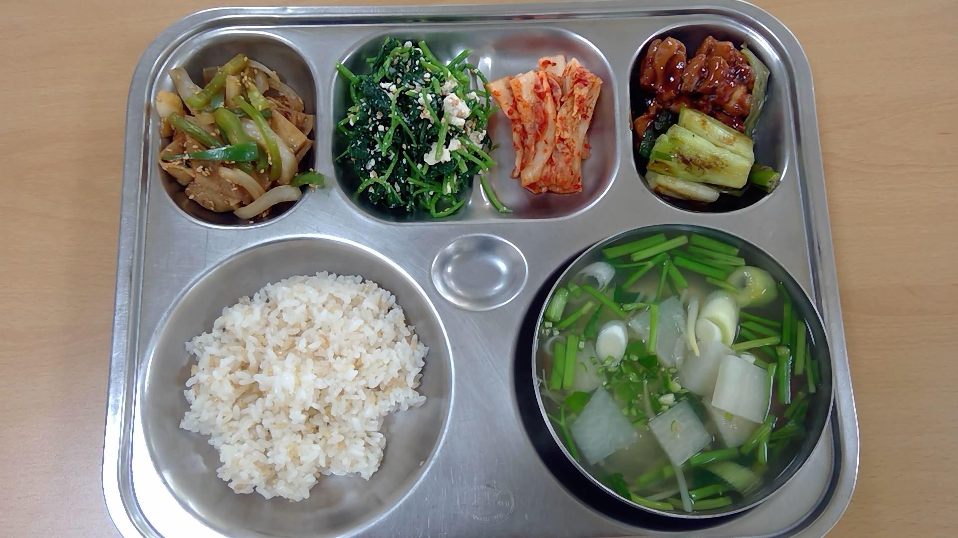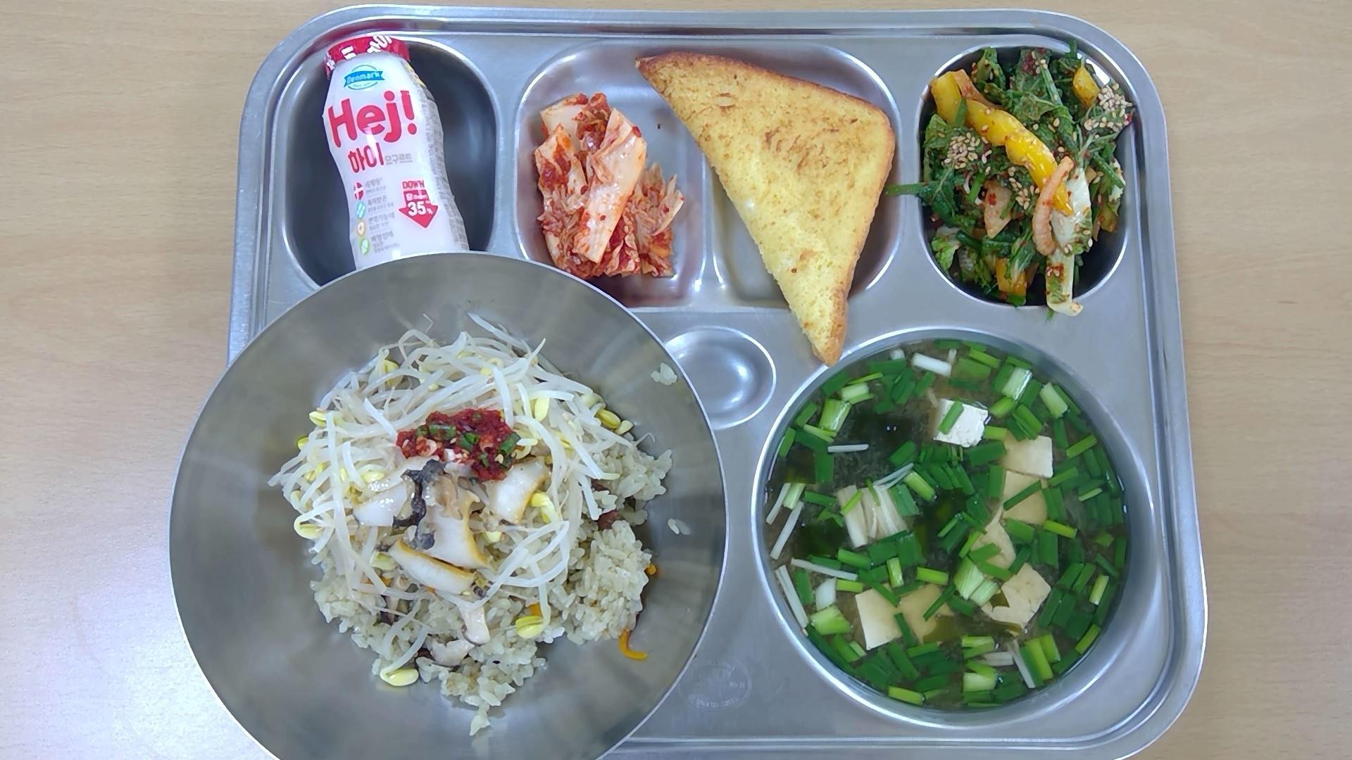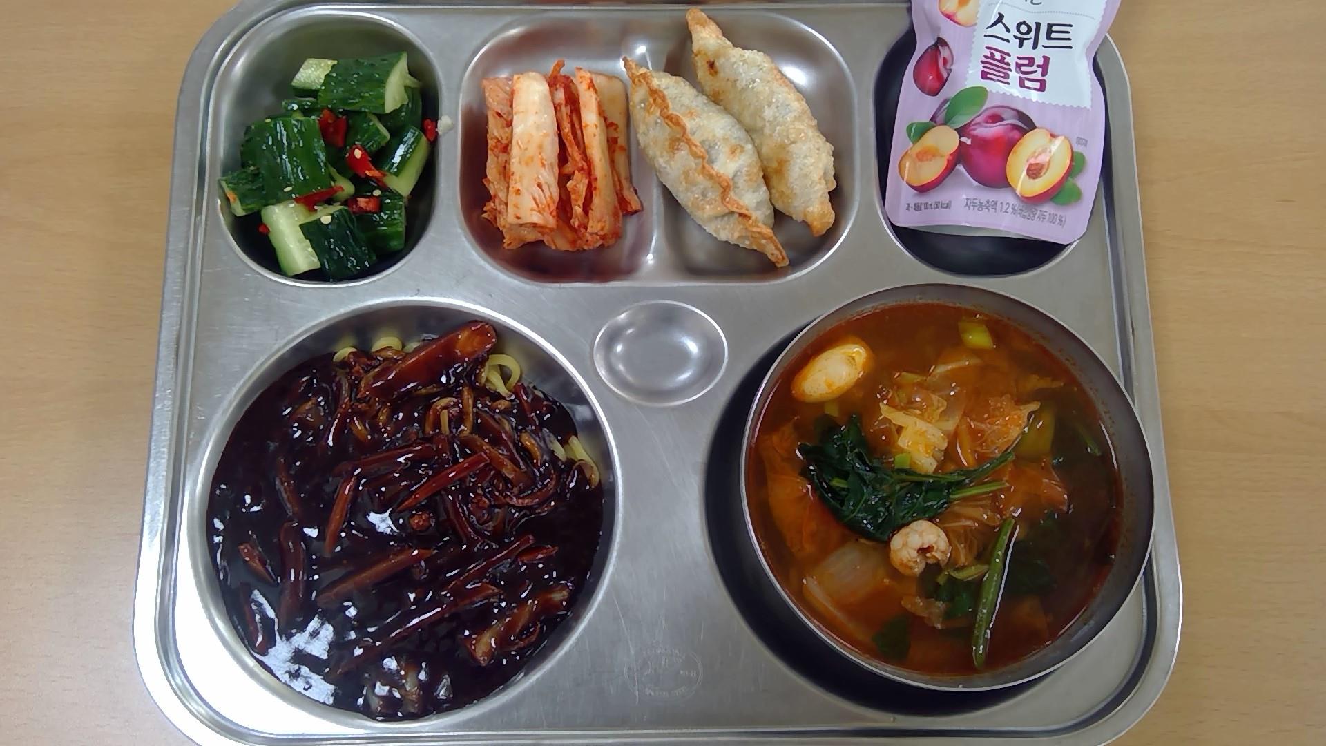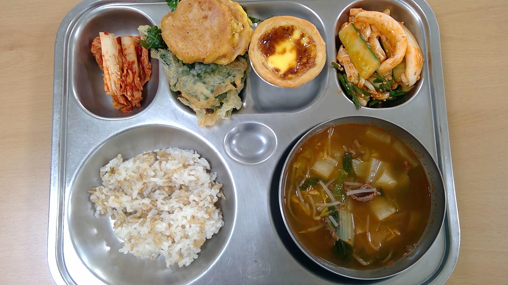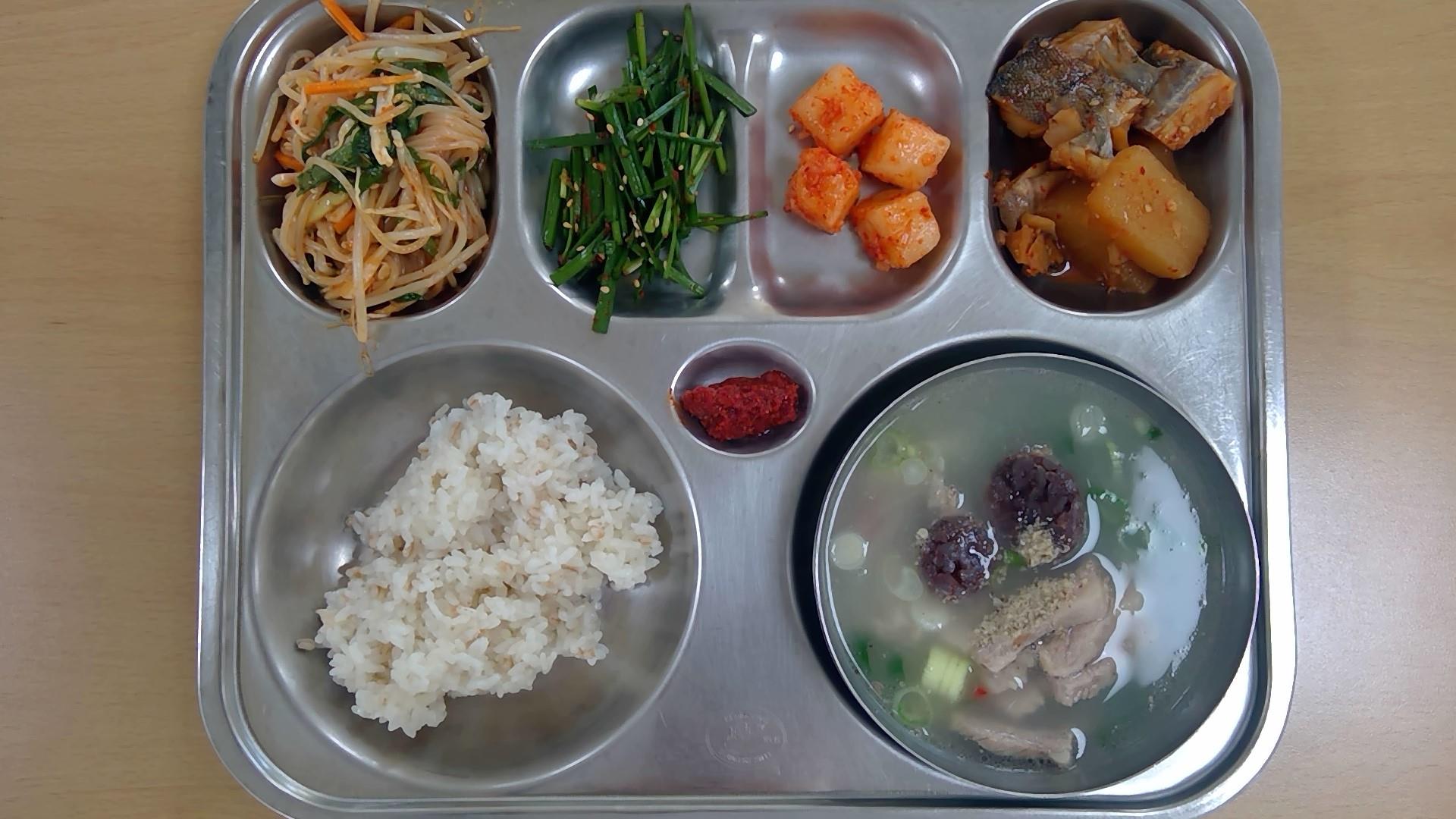 ㆍ귀리밥 ㆍ육개장(5.6.16) ㆍ오이오징어초무침(5.6.13.17) ㆍ깻잎전/옛날소시지전(1.2.5.6.10.15.16) ㆍ에그타르트(1.2.5.6) ㆍ배추김치(9) ㆍ우유(2) | ㆍ찰현미밥 ㆍ아귀지리탕.(5) ㆍ참나물두부무침(5.6) ㆍ어묵볶음(1.5.6.13) ㆍ닭순살대파양념구이(5.6.13.15) ㆍ배추김치(9) ㆍ우유(2) | ㆍ(흰밥) ㆍ다채짬짜면(5.6.9.10.13.16.17.18) ㆍ오이송송이무침(13) ㆍ교자군만두(1.5.6.10.15.16.18) ㆍ배추김치(9) ㆍ우유(2) ㆍ자두쥬스 | ㆍ통밀밥(6) ㆍ순대돼지국밥(2.5.6.9.10.13.16) ㆍ코다리순살조림(5.6.13) ㆍ부추무침(5.6.13) ㆍ쫄면콩나물무침(5.6.13) ㆍ깍두기(9) ㆍ우유(2) | ㆍ전복콩나물밥(5.6.18) ㆍ미소된장국(5.6) ㆍ쌈추겉절이(5.6.13) ㆍ배추김치(9) ㆍ달콤오븐토스트(1.2.5.6.13) ㆍ우유(2) ㆍ액상요구르트(2) |