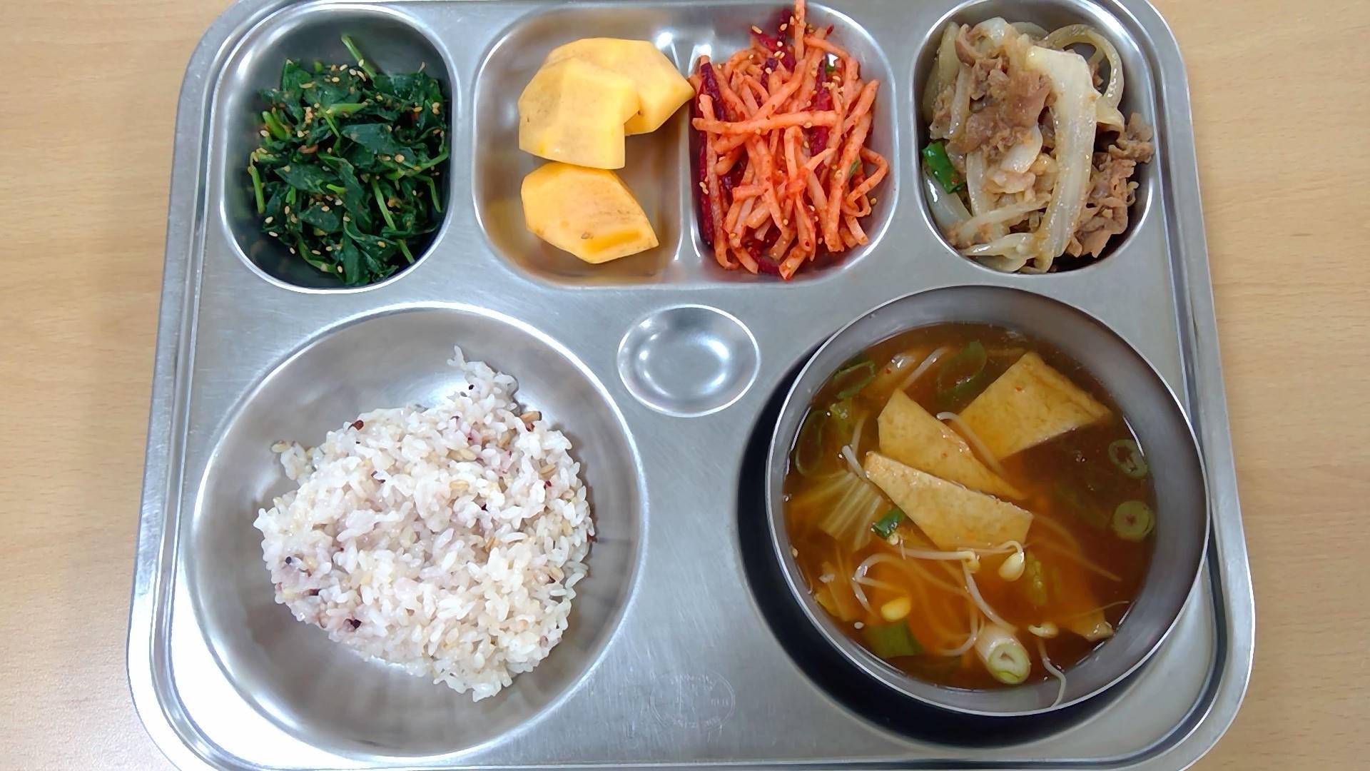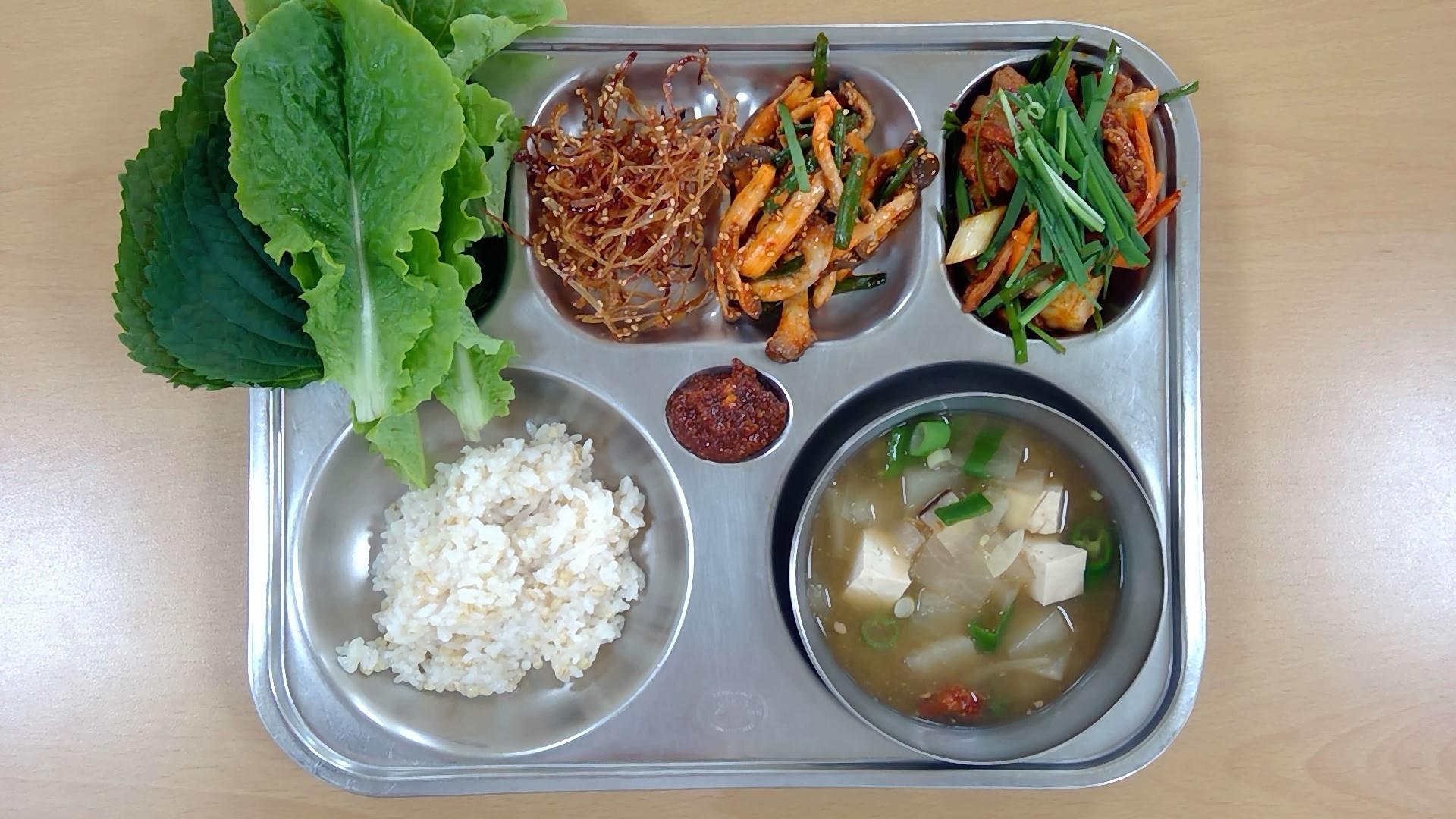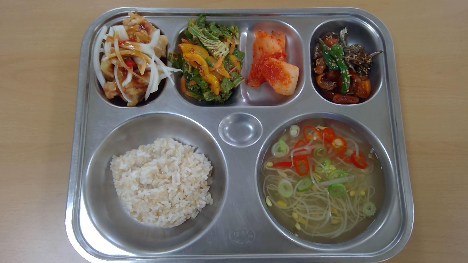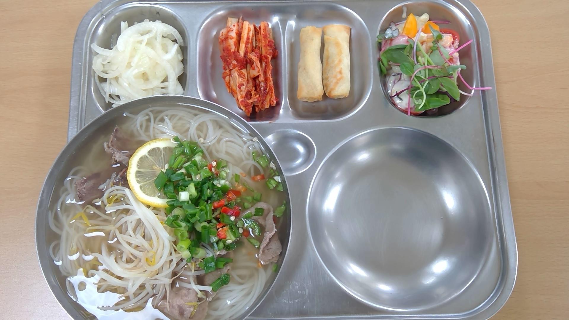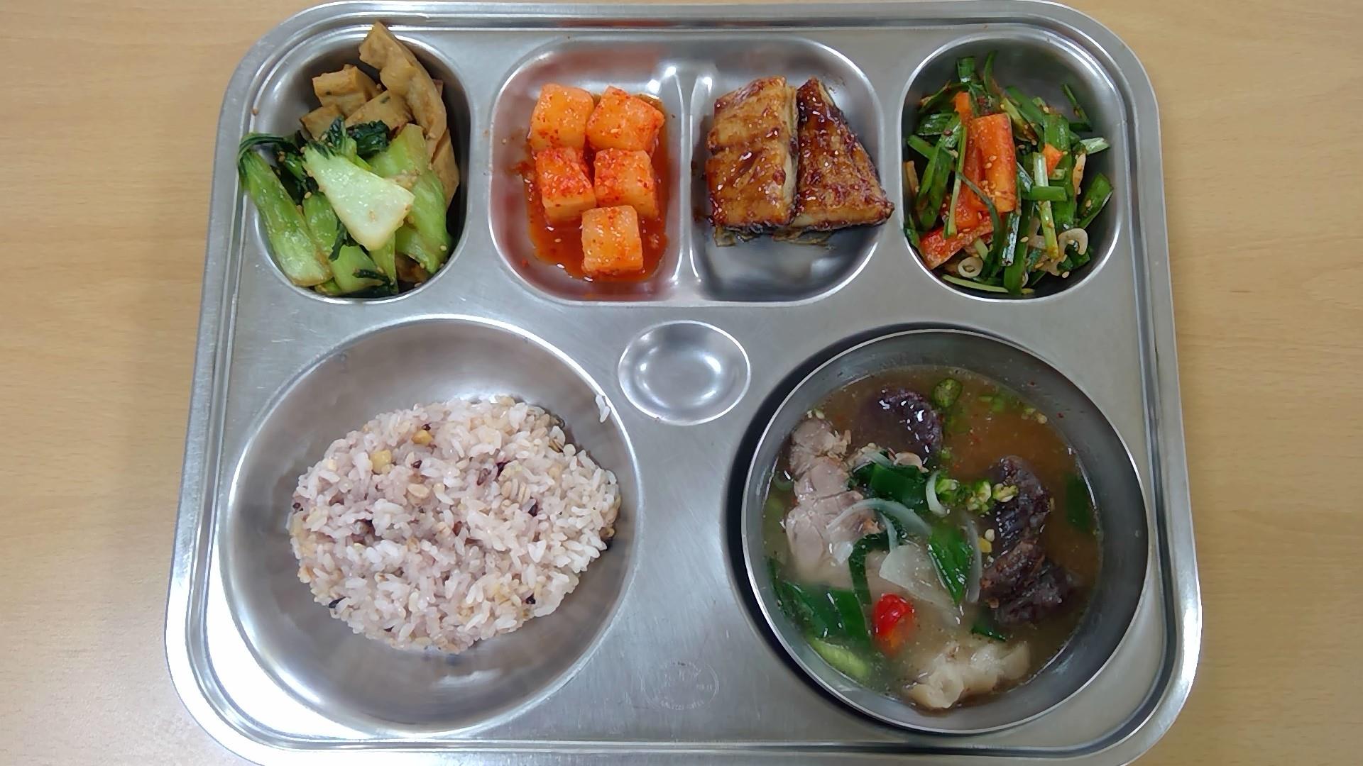 ㆍ찰보리밥 ㆍ콩나물무채국(5.9) ㆍ쌈추겉절이(5.6.13) ㆍ감말랭이멸치볶음(5.13) ㆍ수제순살깐풍기(5.6.13.15.18) ㆍ석박지(9) ㆍ우유(2) | ㆍ혼합잡곡밥(5) ㆍ순대돼지국밥(2.5.6.9.10.13.16) ㆍ부추무침(5.6.13) ㆍ청경채어묵볶음(1.5.6.13.18) ㆍ임연수어데리야끼소스구이(5.6.13) ㆍ깍두기(9) ㆍ우유(2) | ㆍ베트남쌀국수(5.6.13.15.16.18) ㆍ콘샐러드(1.2.5.6.12) ㆍ무채양파초절임(13) ㆍ춘권(1.5.6.10.16.18) ㆍ배추김치(9) ㆍ우유(2) | ㆍ찰보리밥 ㆍ참미더덕된장국(5.6) ㆍ오징어실채볶음(5.13.17) ㆍ애느타리잔파초무침(5.6.13) ㆍ오리부추볶음(5.6.13) ㆍ(상추/깻잎쌈)(5.6.13) ㆍ우유(2) | ㆍ혼합잡곡밥(5) ㆍ어묵김치국(1.5.6.8.9.17.18) ㆍ방풍나물무침(5.6) ㆍ비트무생채(13) ㆍ돈육파채불고기(5.6.10.13) ㆍ단감 ㆍ우유(2) |