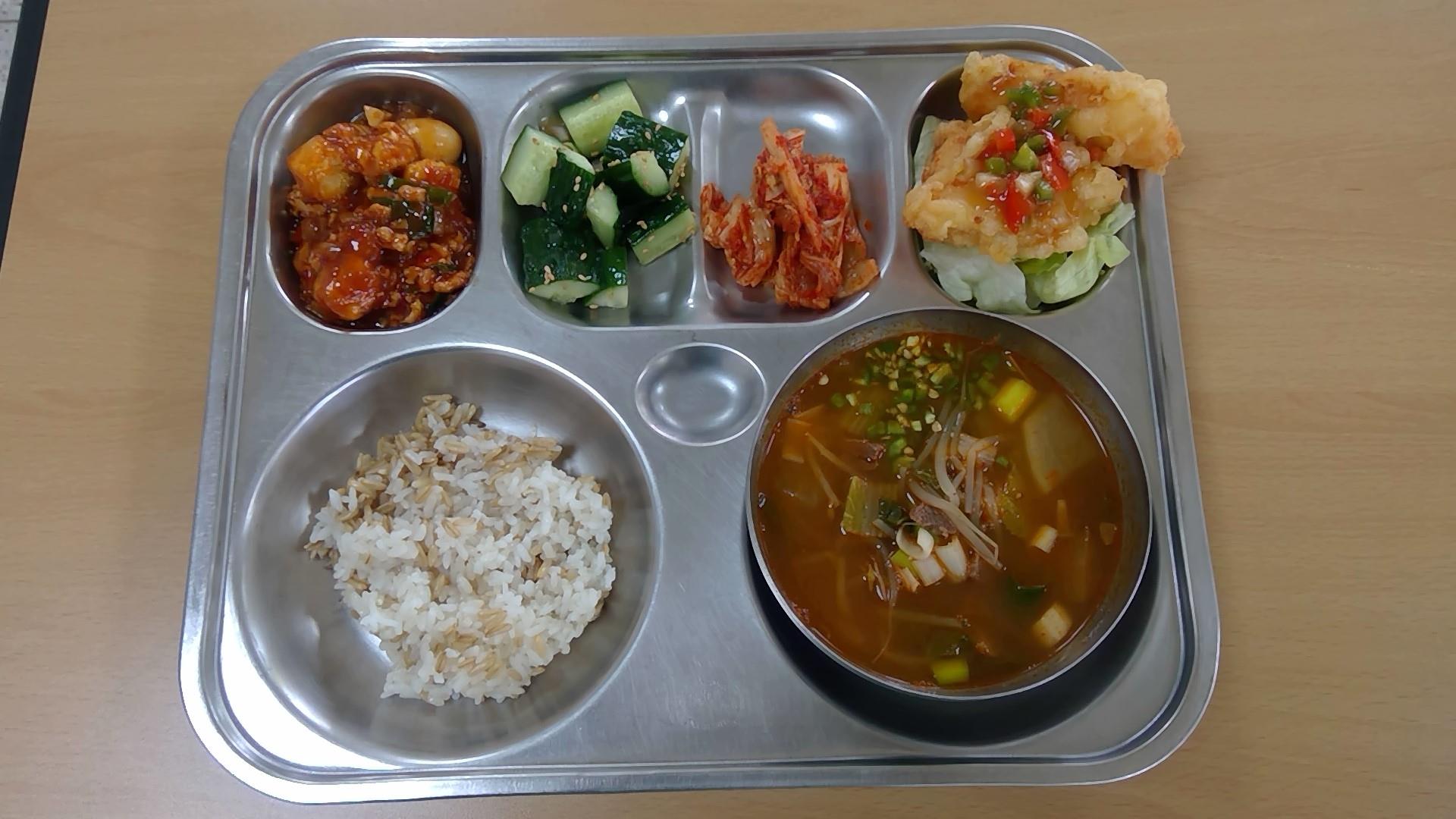 귀리밥, 육개장, 가자미유린기, 오이송송이 무침, 마파두부메추리알볶음, 배추김치, 우유